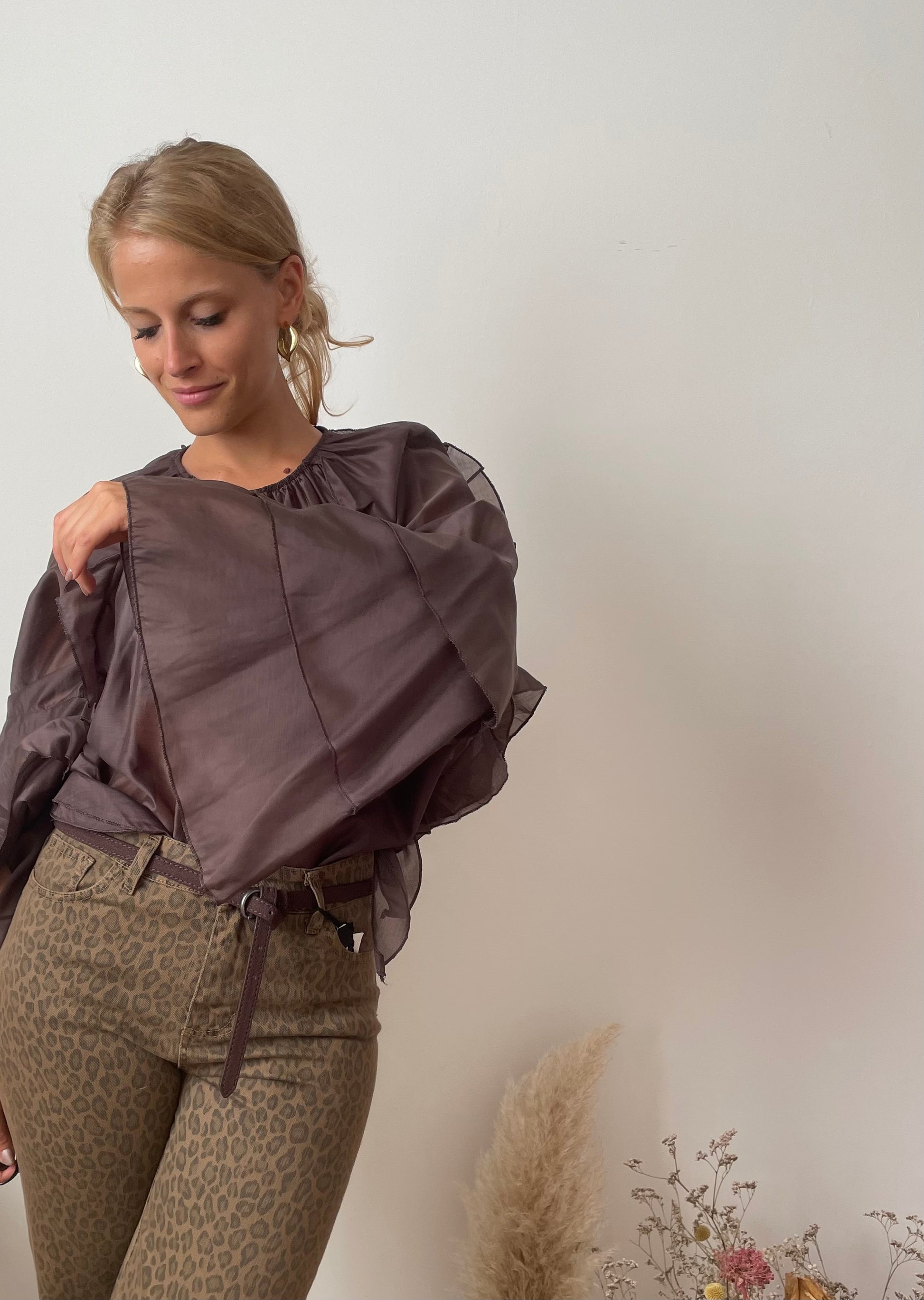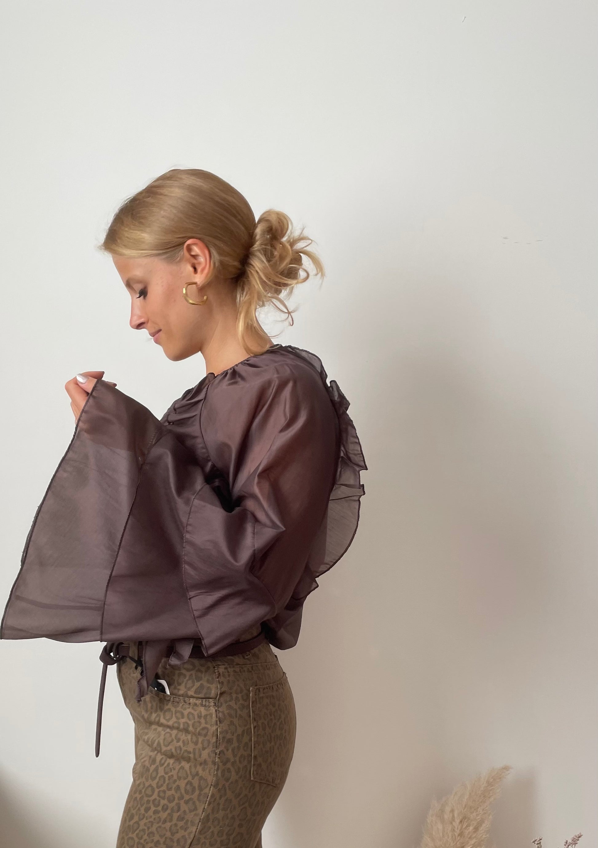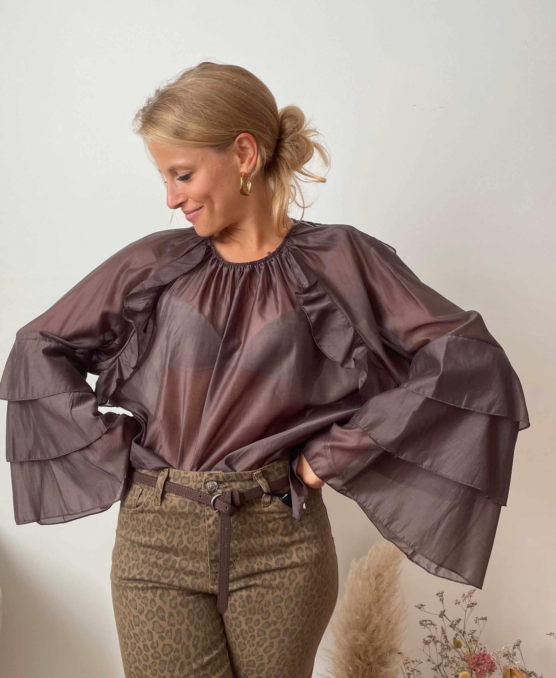 Camicetta semi-trasparente con voulant e maniche molto ampie.