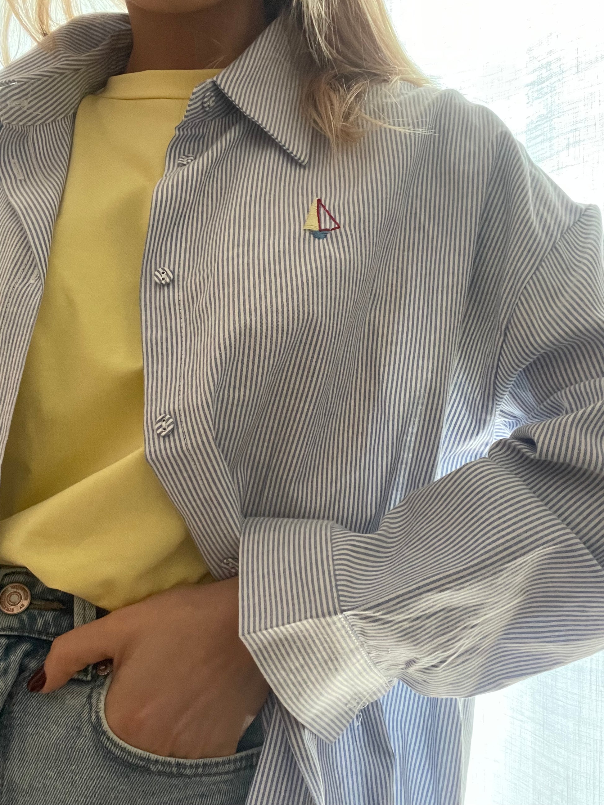 Camicia lunga in cotone, dalla rigatura classica bianca e azzurra intramontabile.