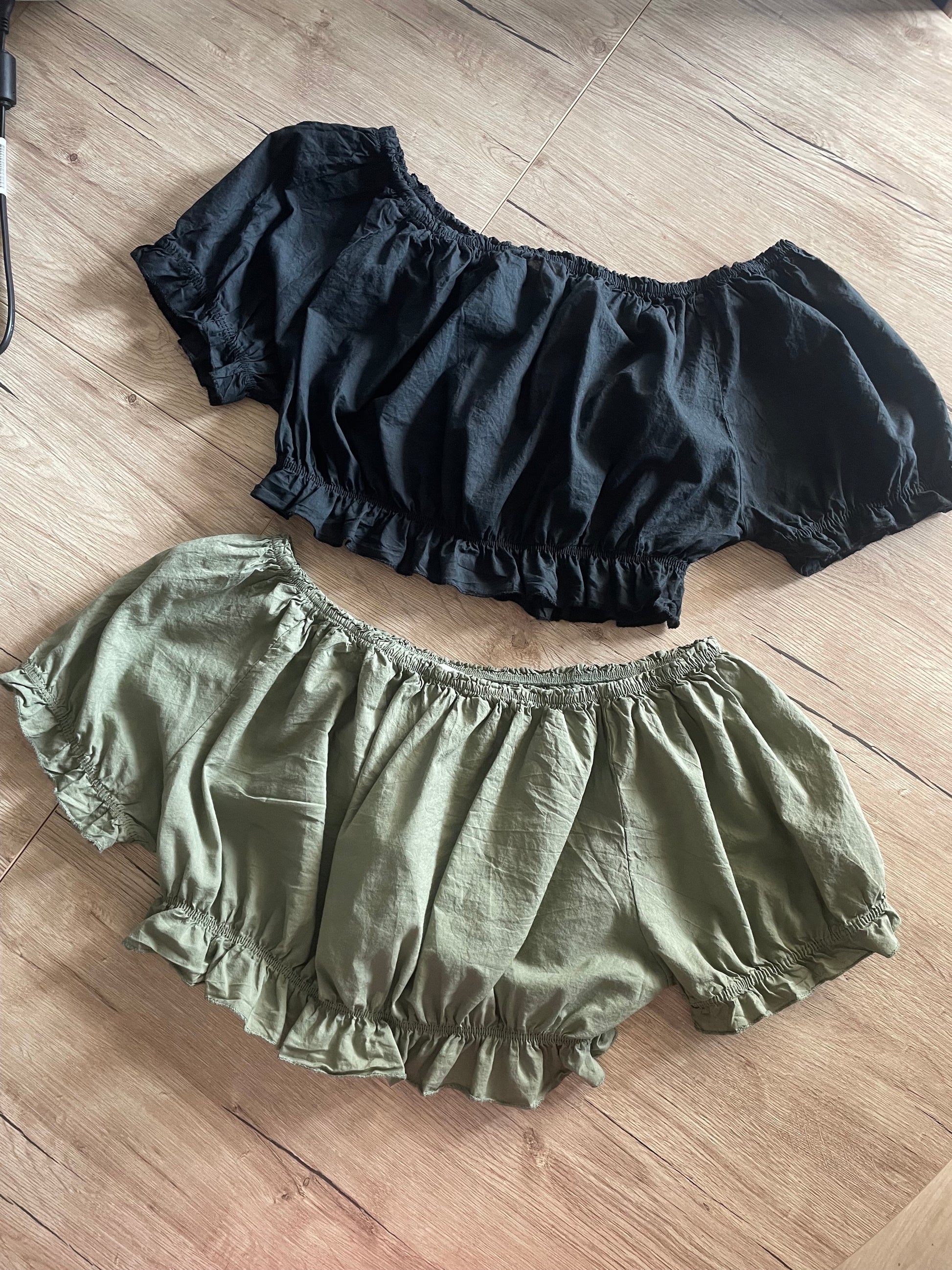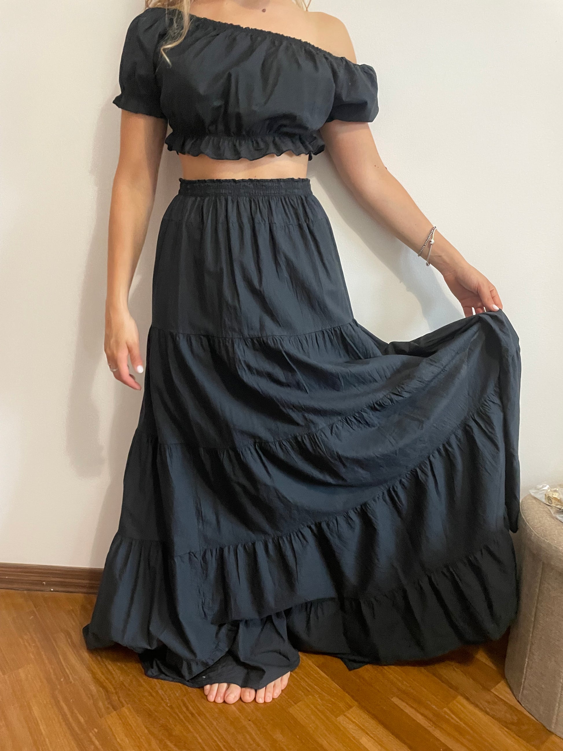 Completo composto da gonna lunga con spacco laterale, elastico in vita e top corto arricciato.