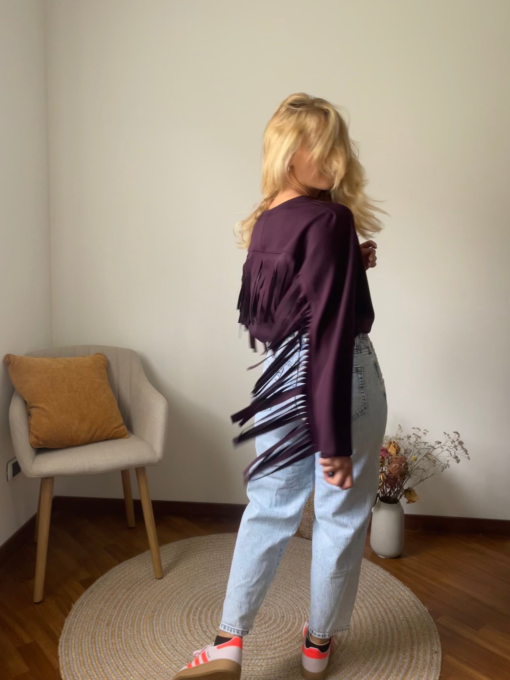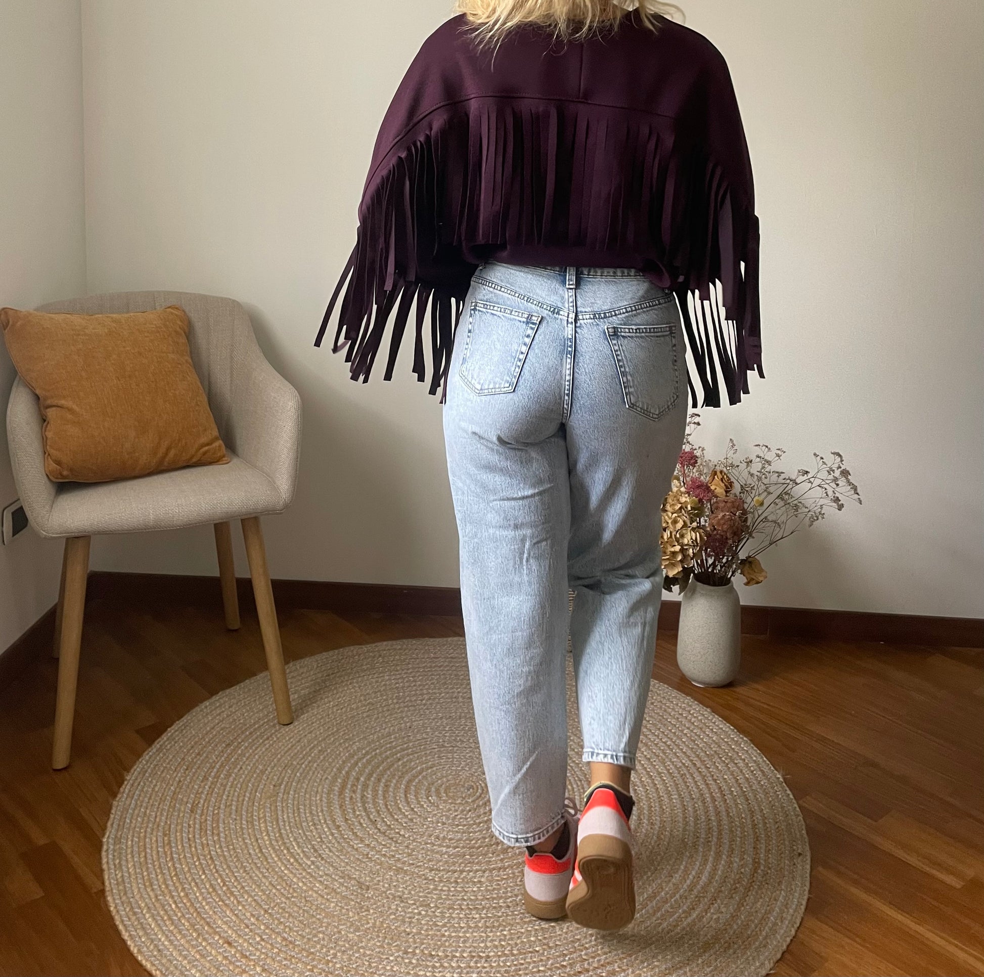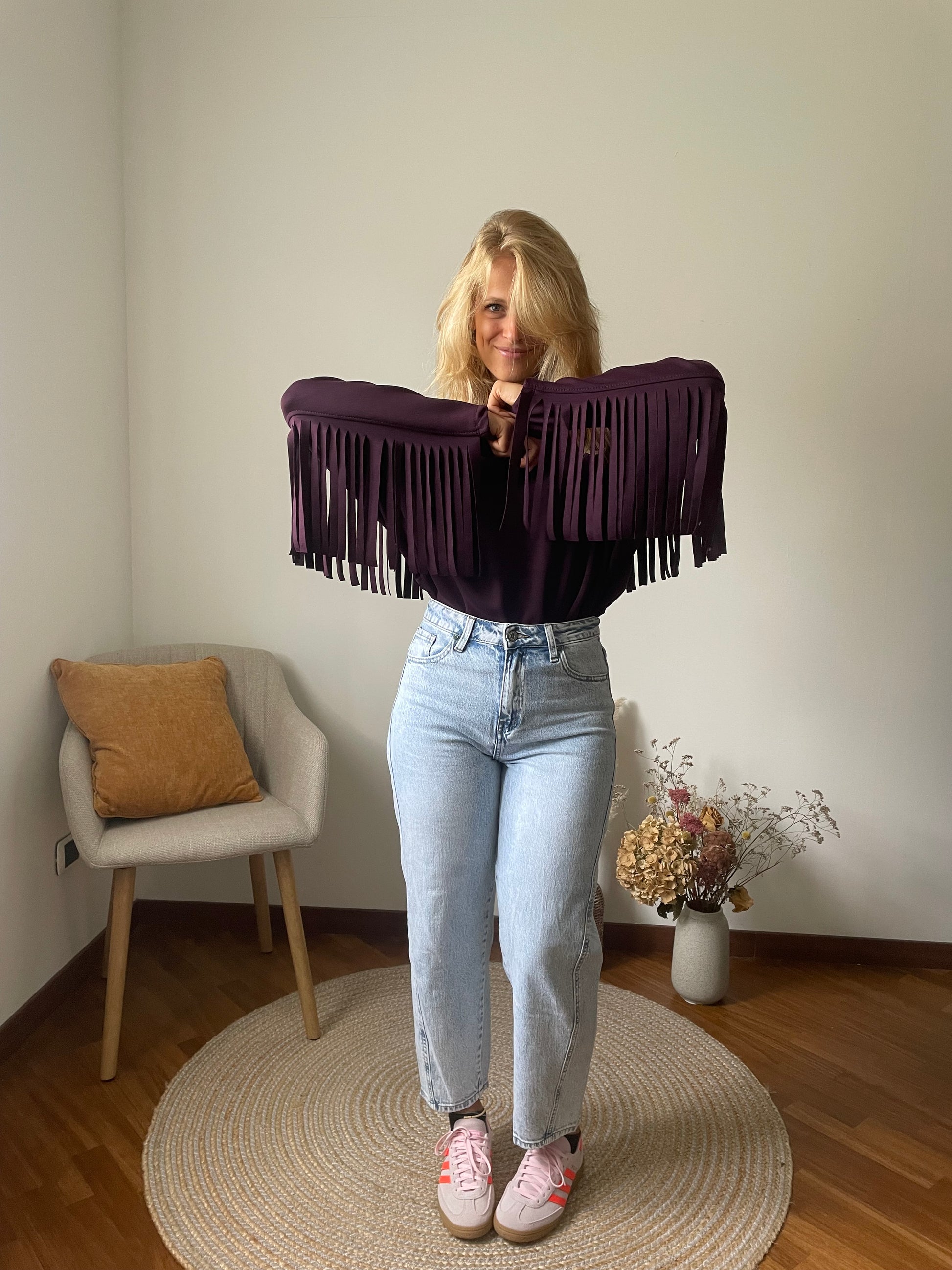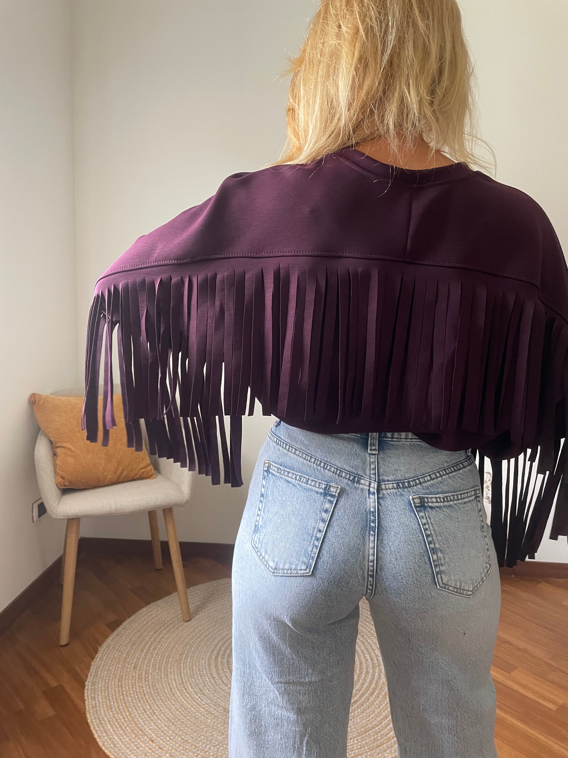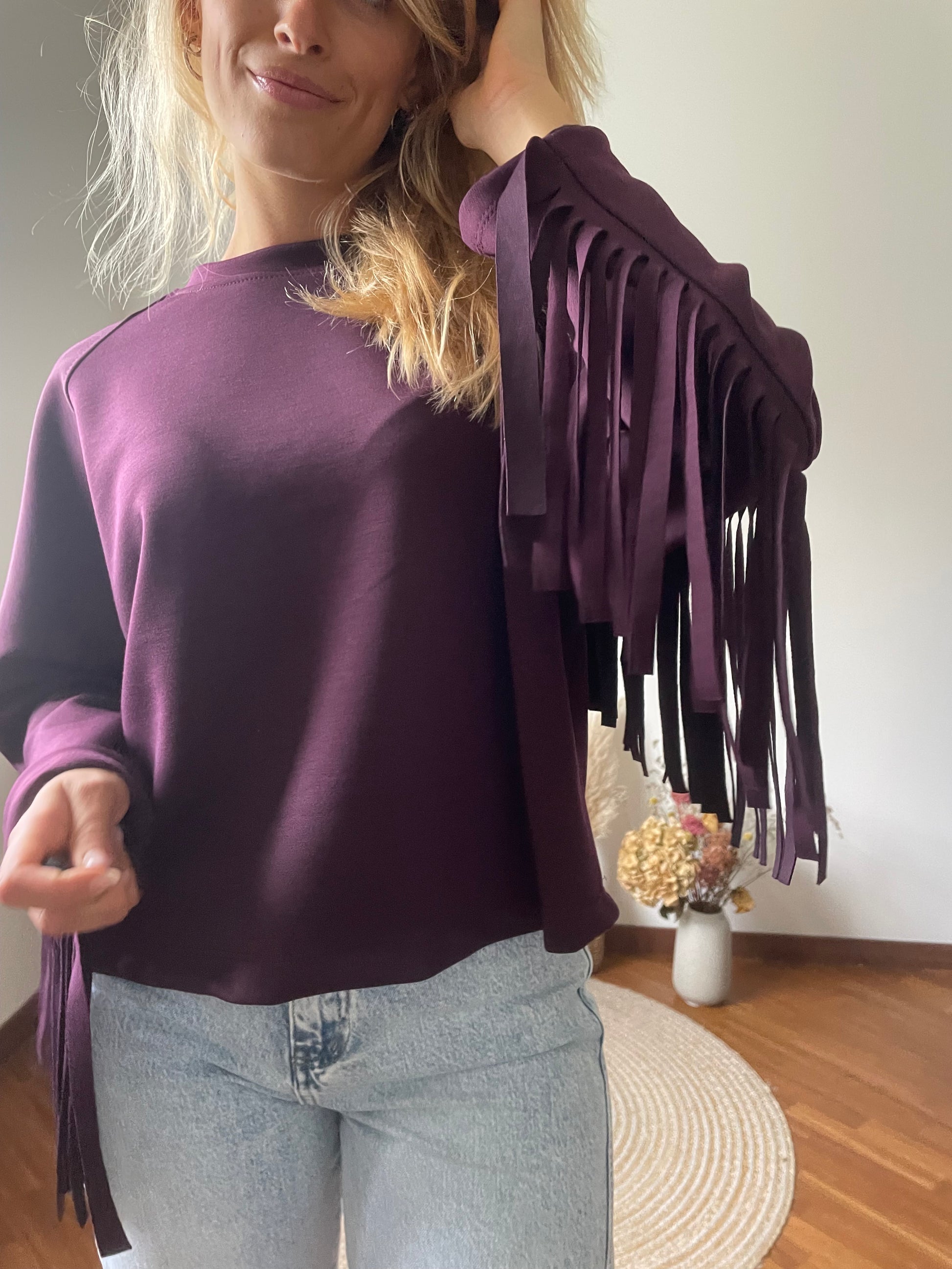 Felpa color prugna con frange.