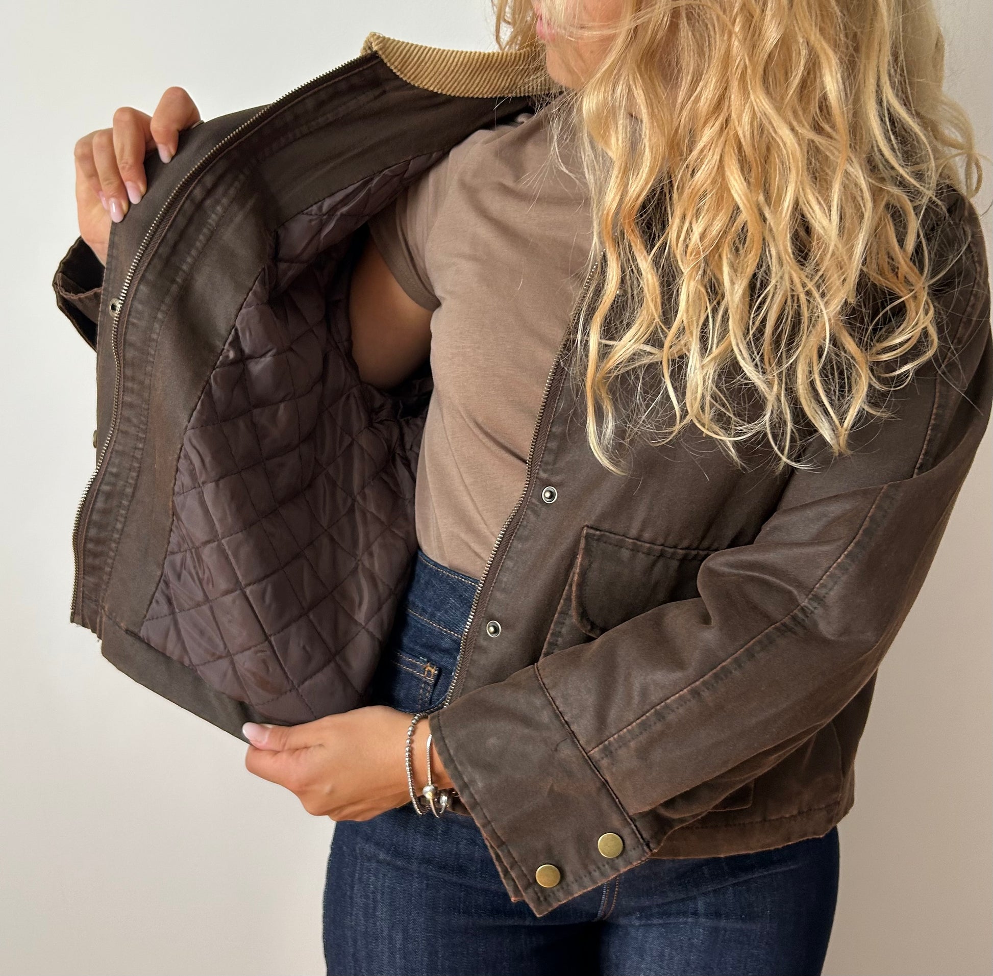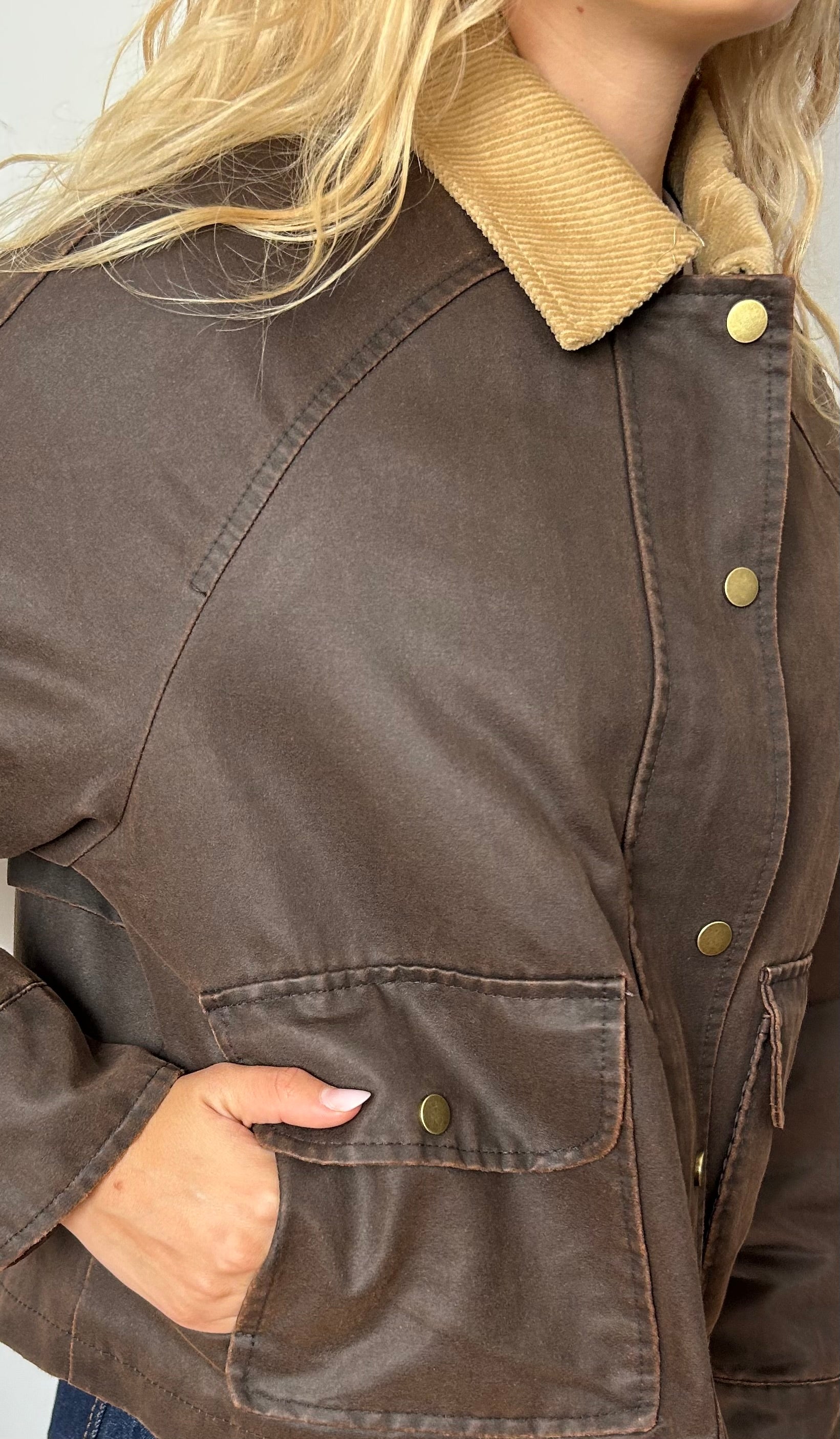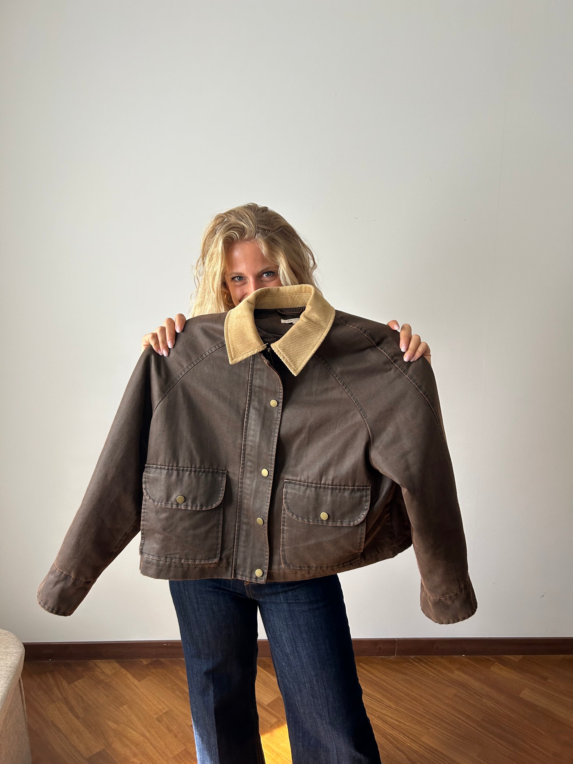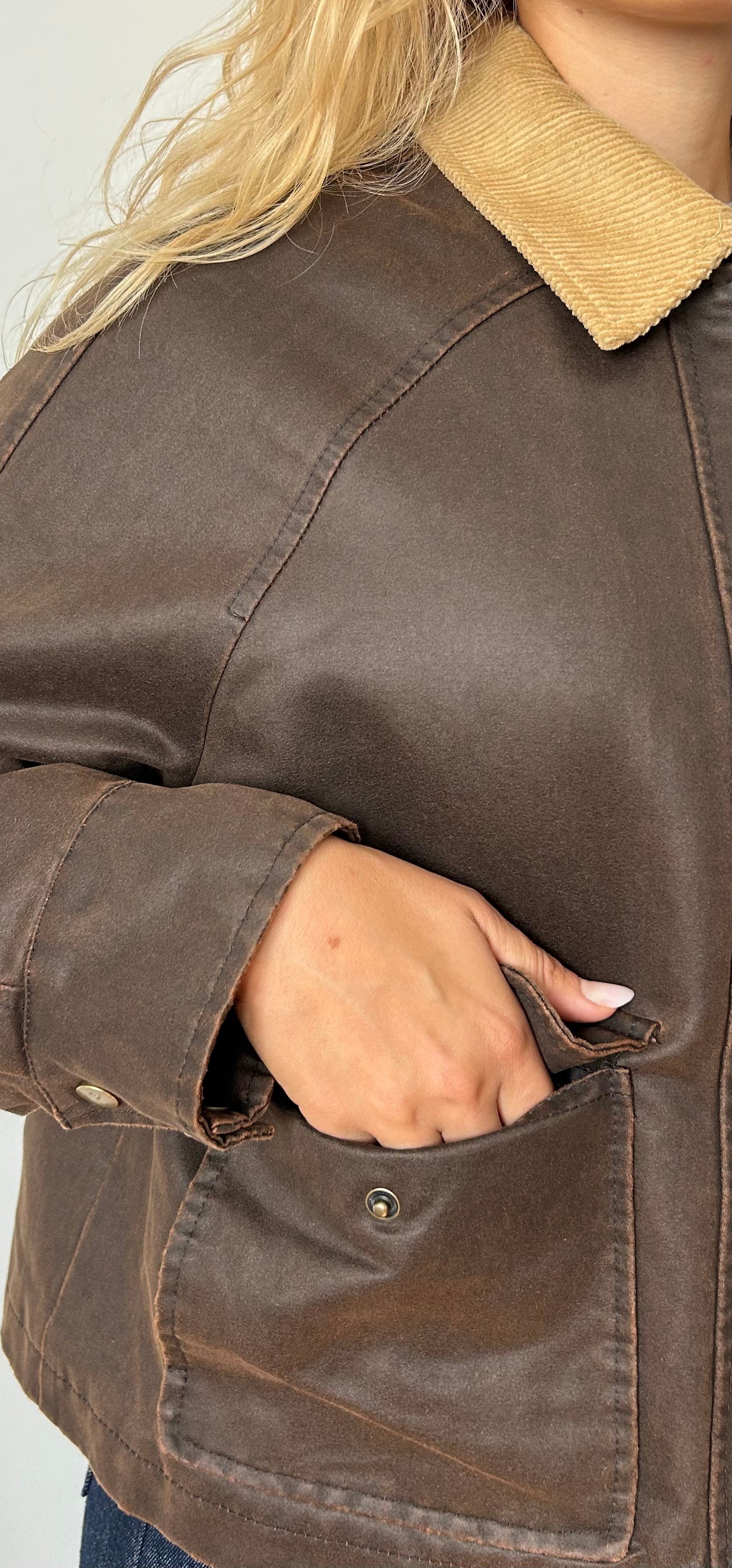 Colletto in velluto a coste color begiolino/nocciola a creare contrasto con il marrone della giacca.