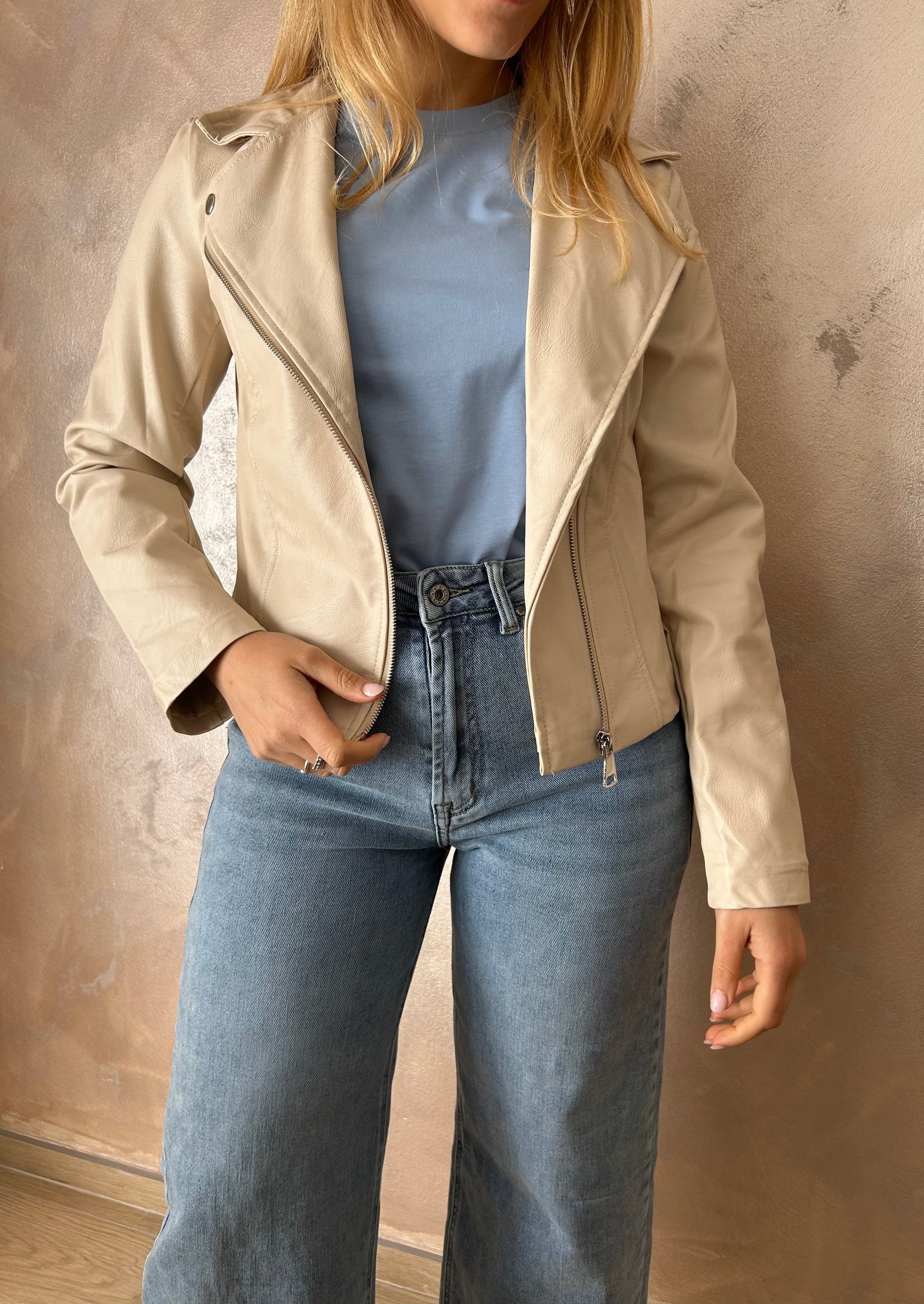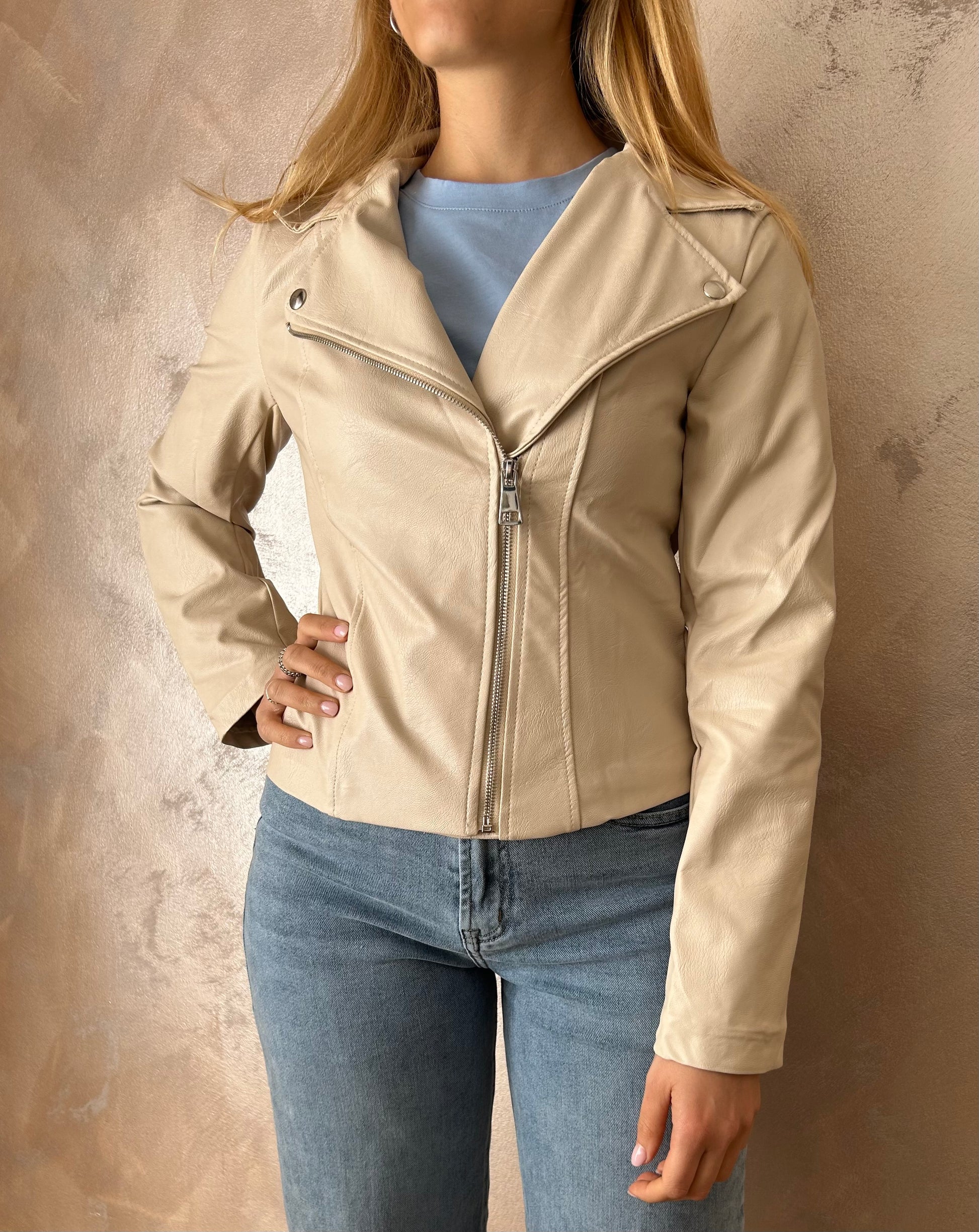 Giacchino in ecopelle, colore neutro che abbini davvero con tutto. Stile versatile perfetto per la vita frenetica di tutti i giorni, alle serate più glamour o addirittura per le tue occasioni più speciali.