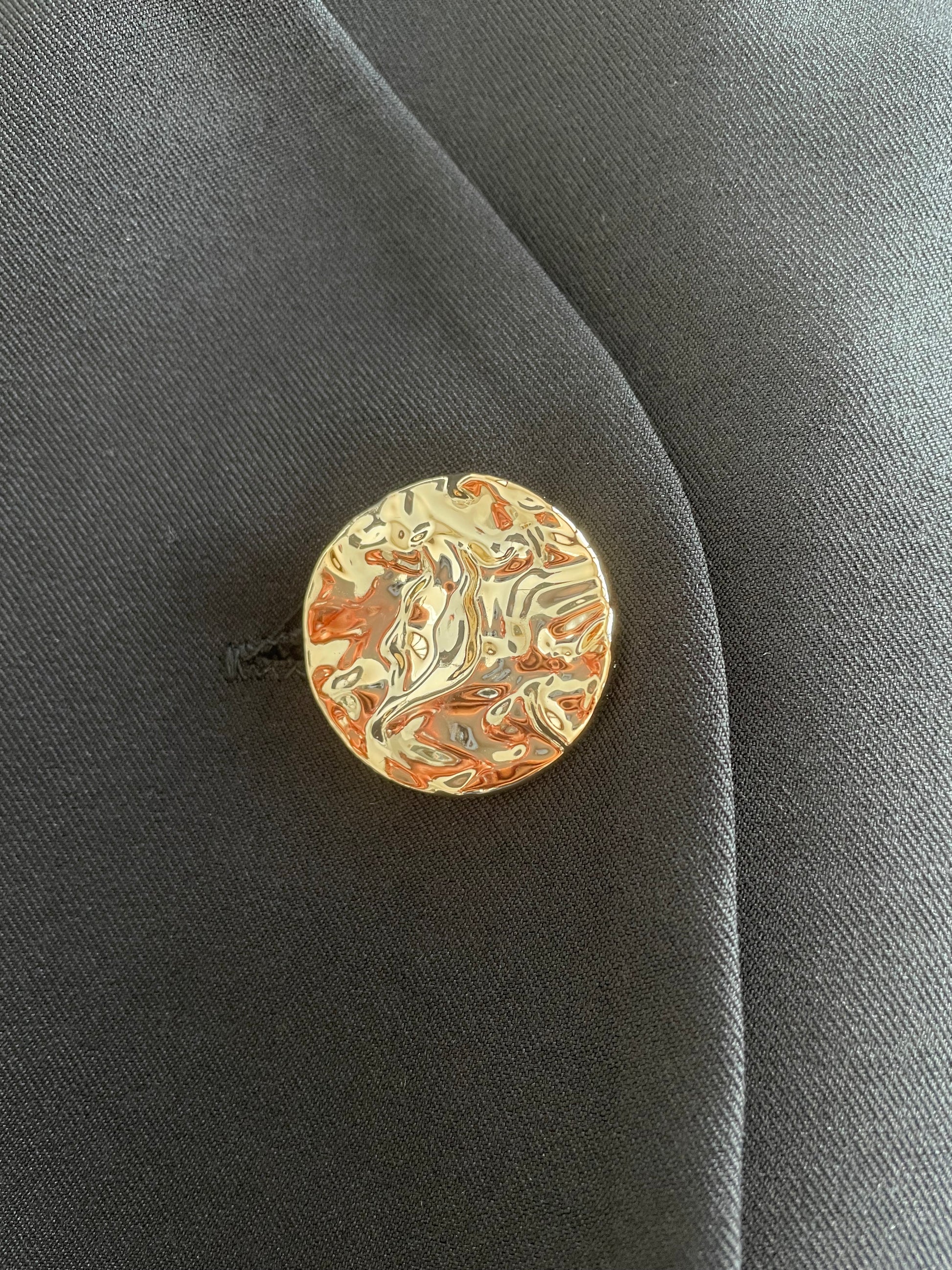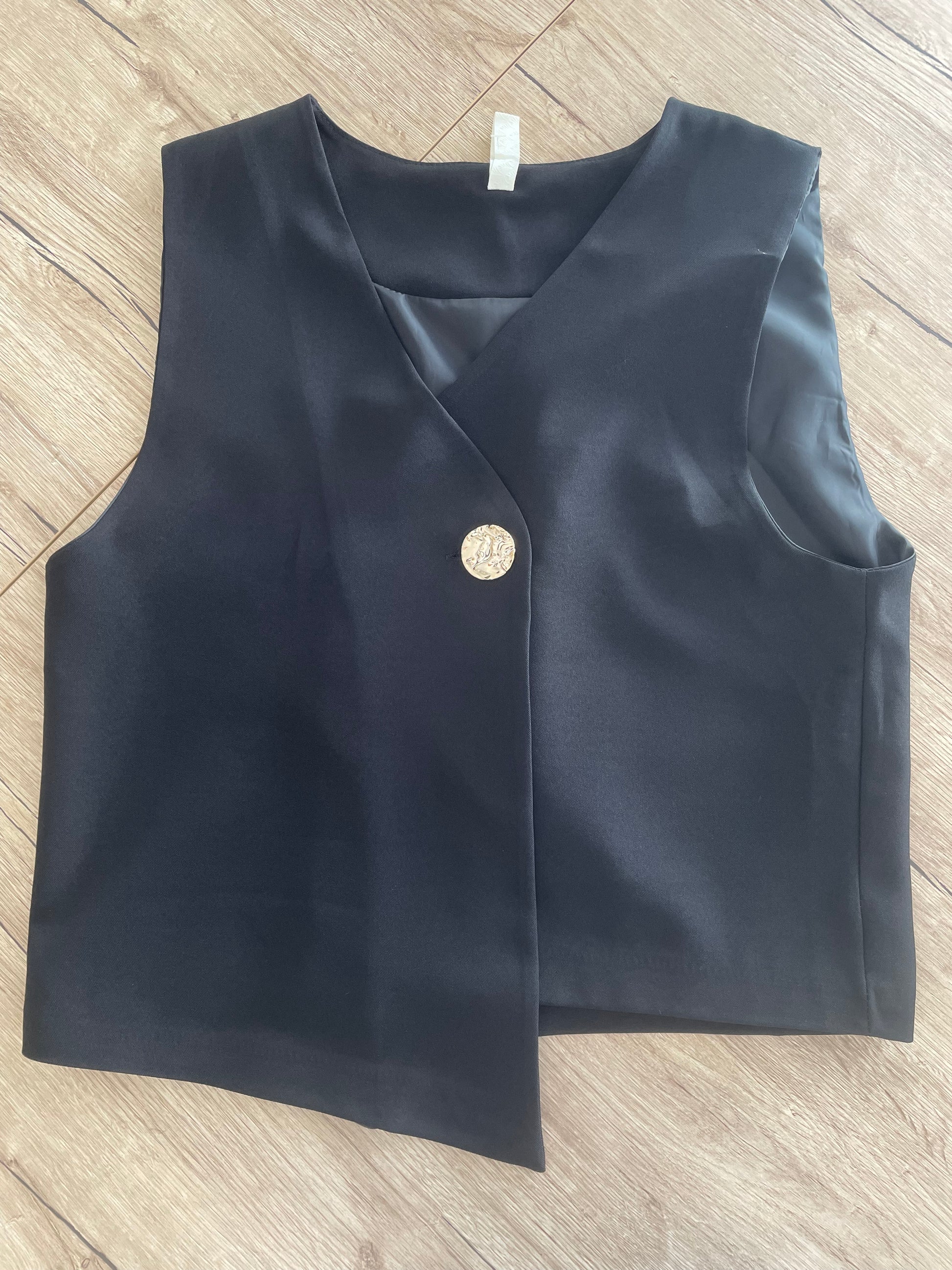 Gilet nero taglio asimmetrico, impreziosito da un bottone gioiello lavorato color oro.