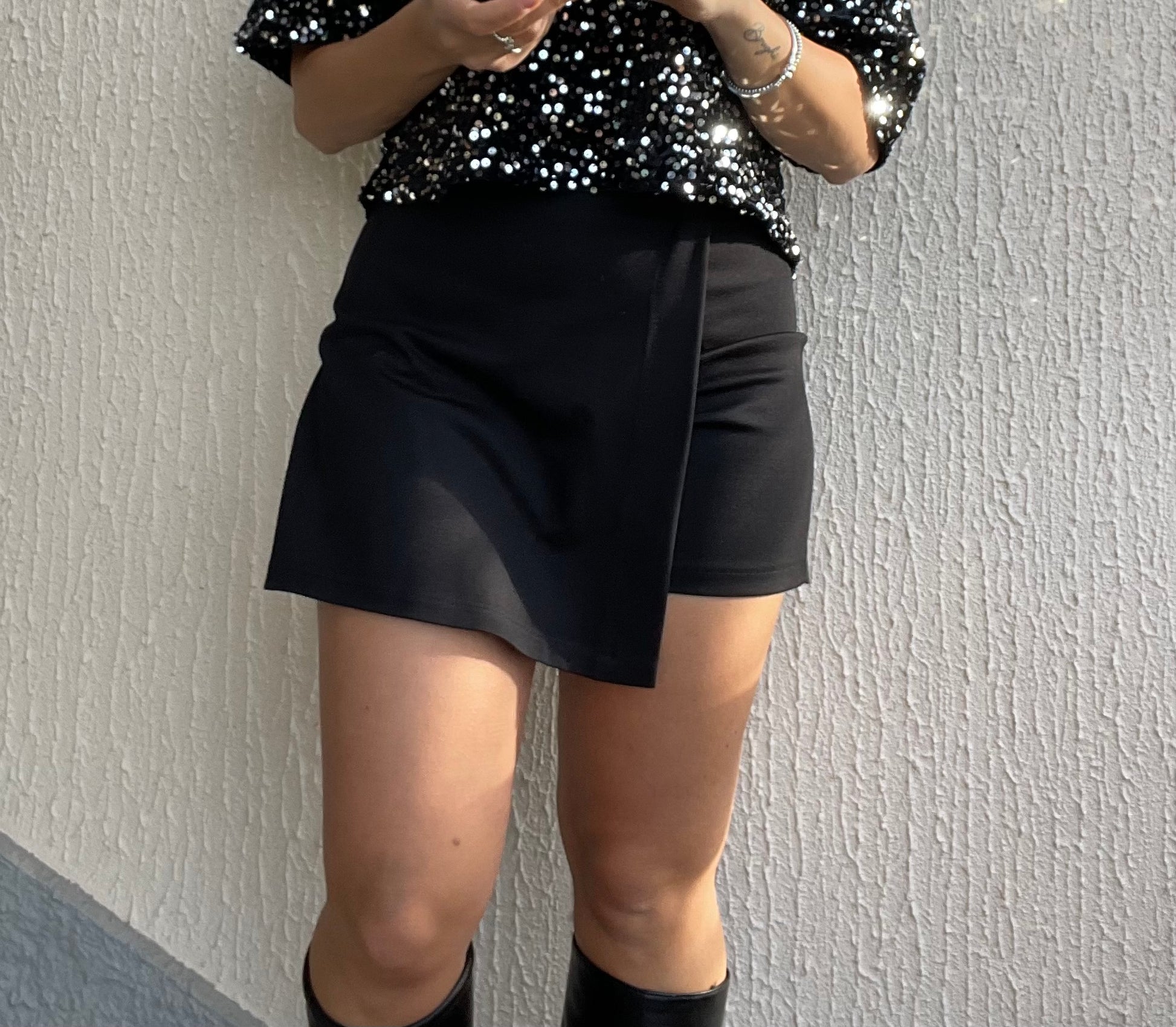 Gonna-pantaloncini nera con zip centrale posteriore.
