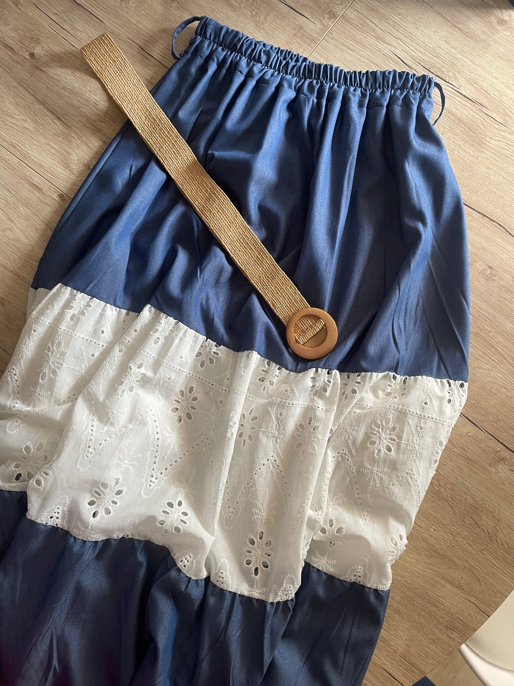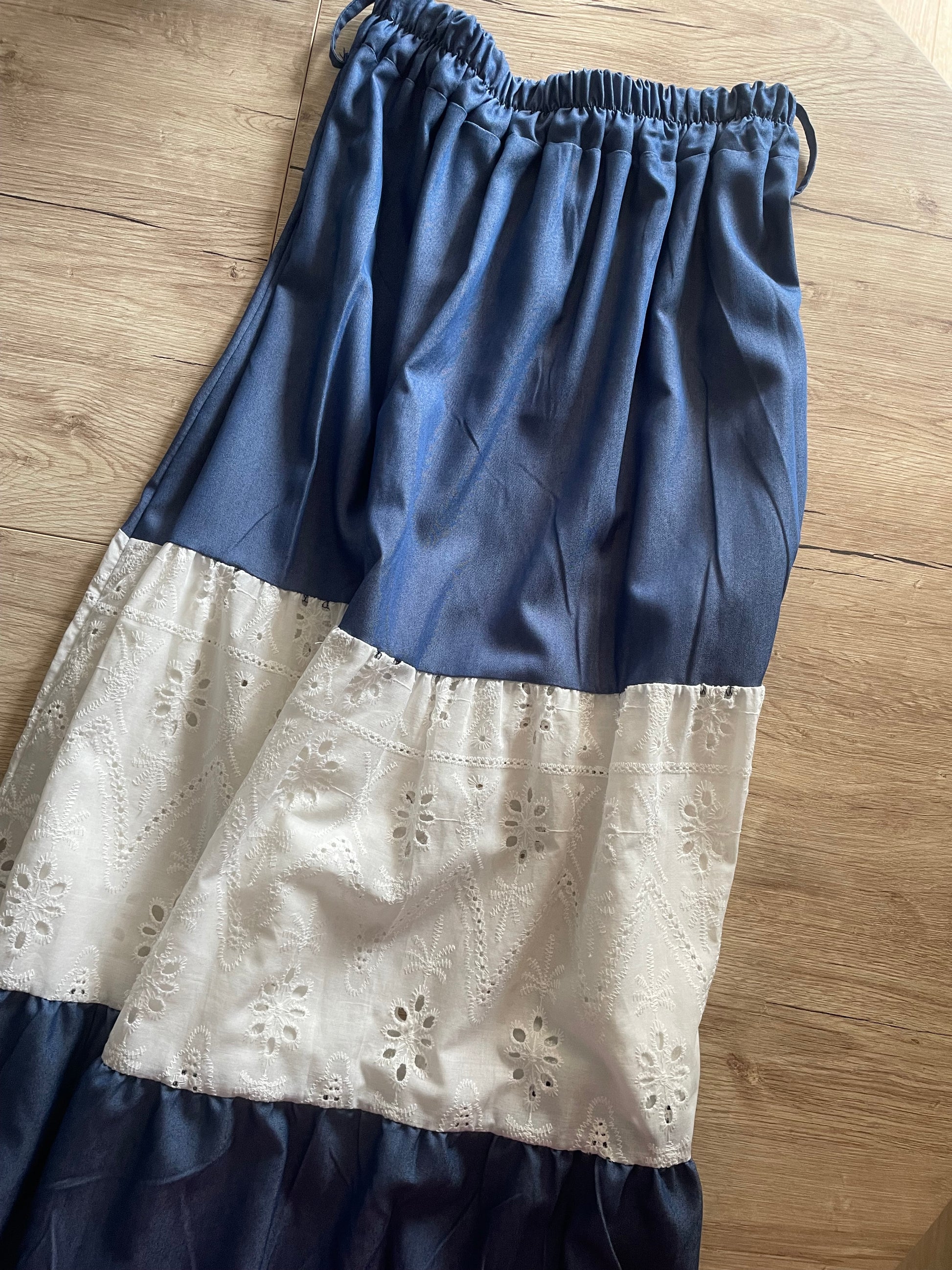 Gonna lunga in misto viscosa, con banda centrale in pizzo San gallo.