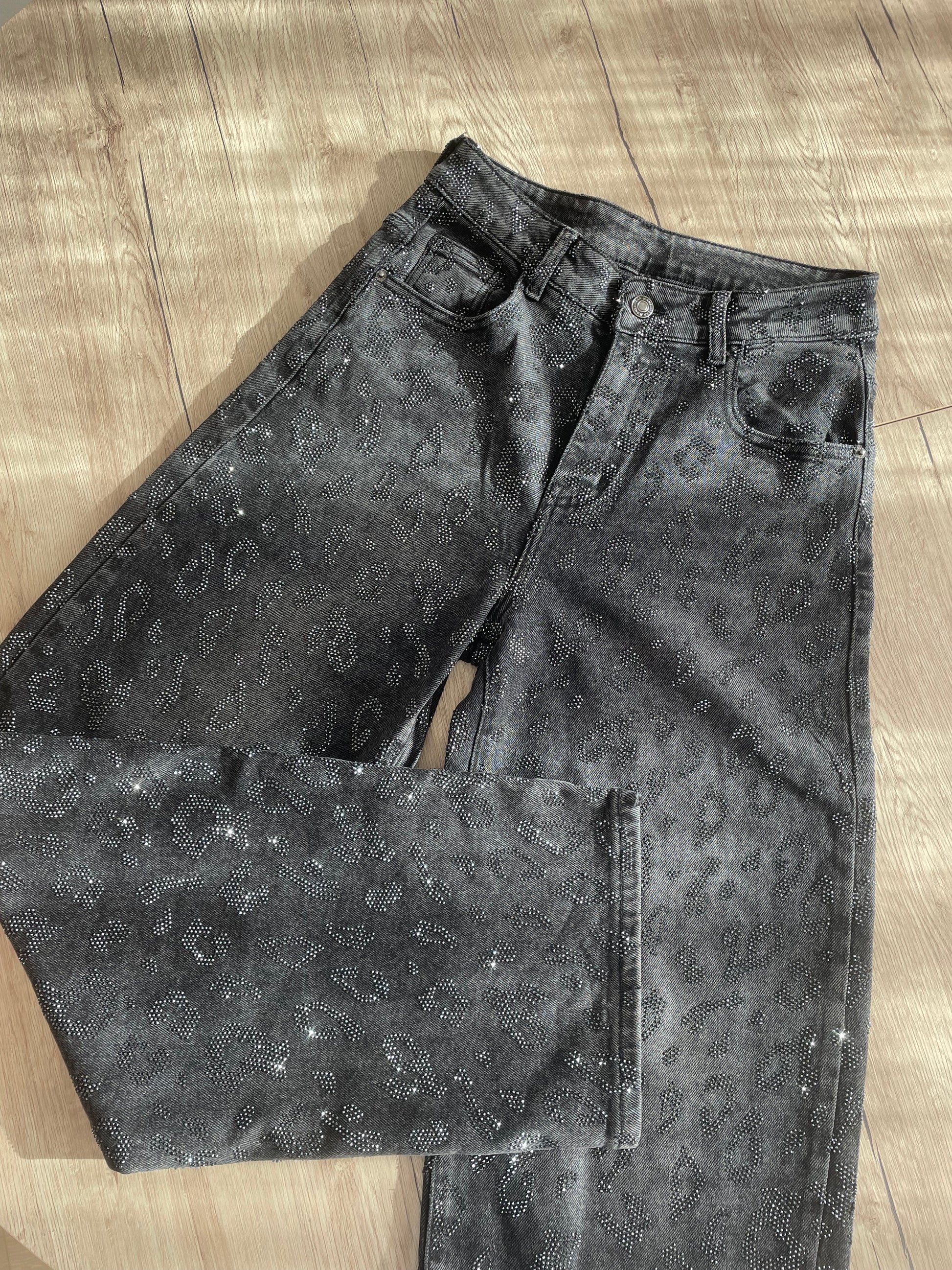Jeans nero slavato, glitterato a fantasia animalier.