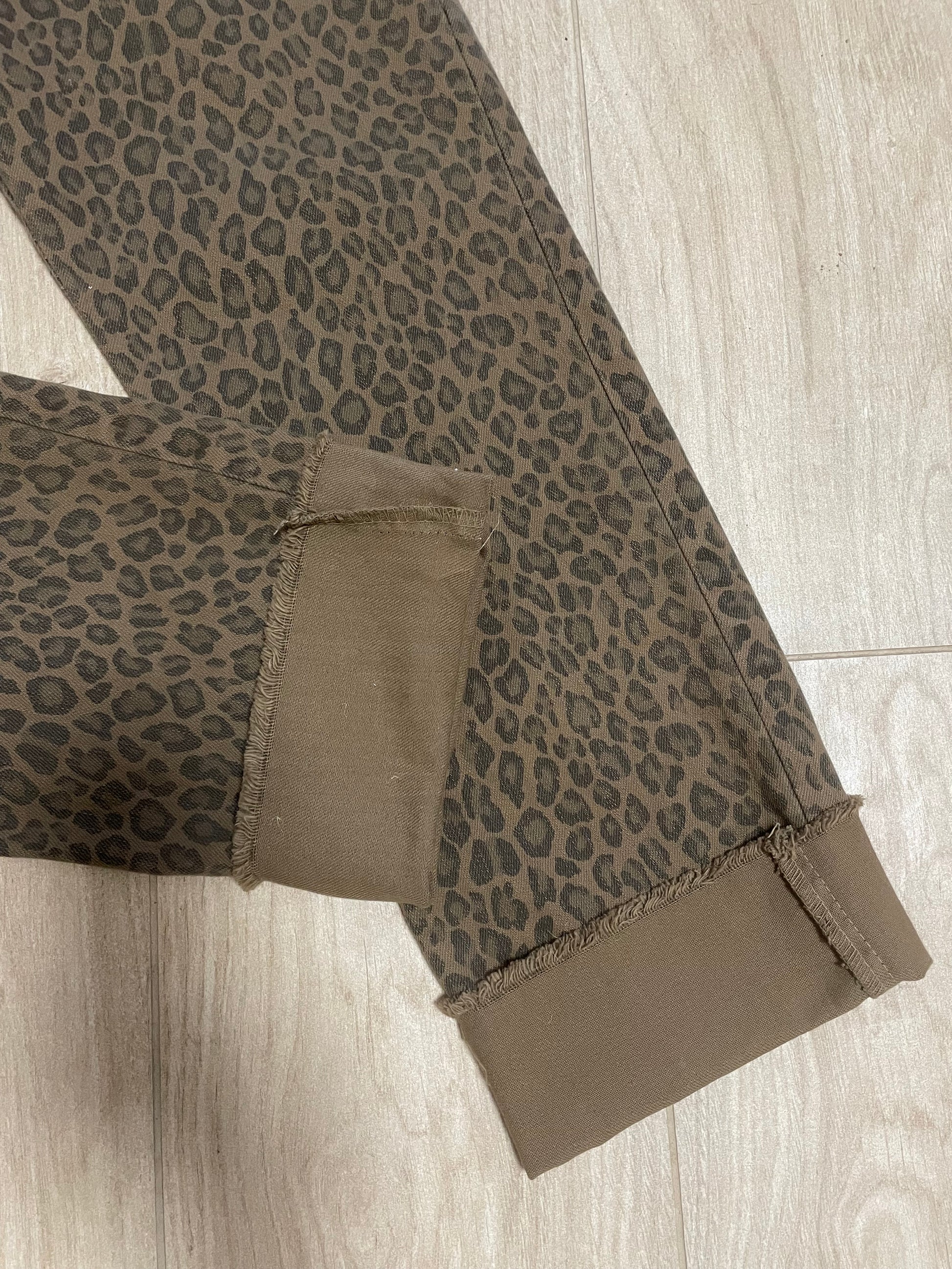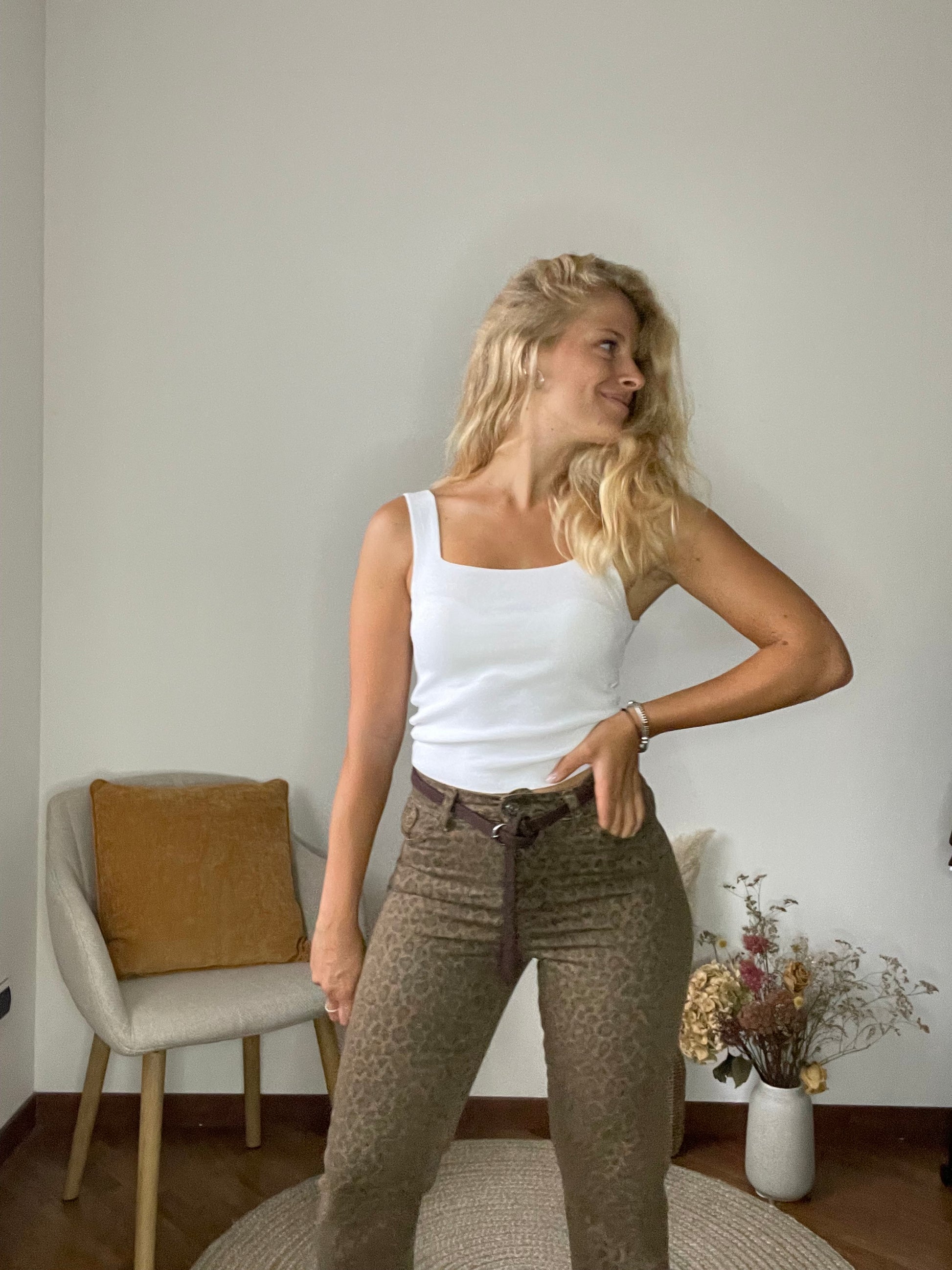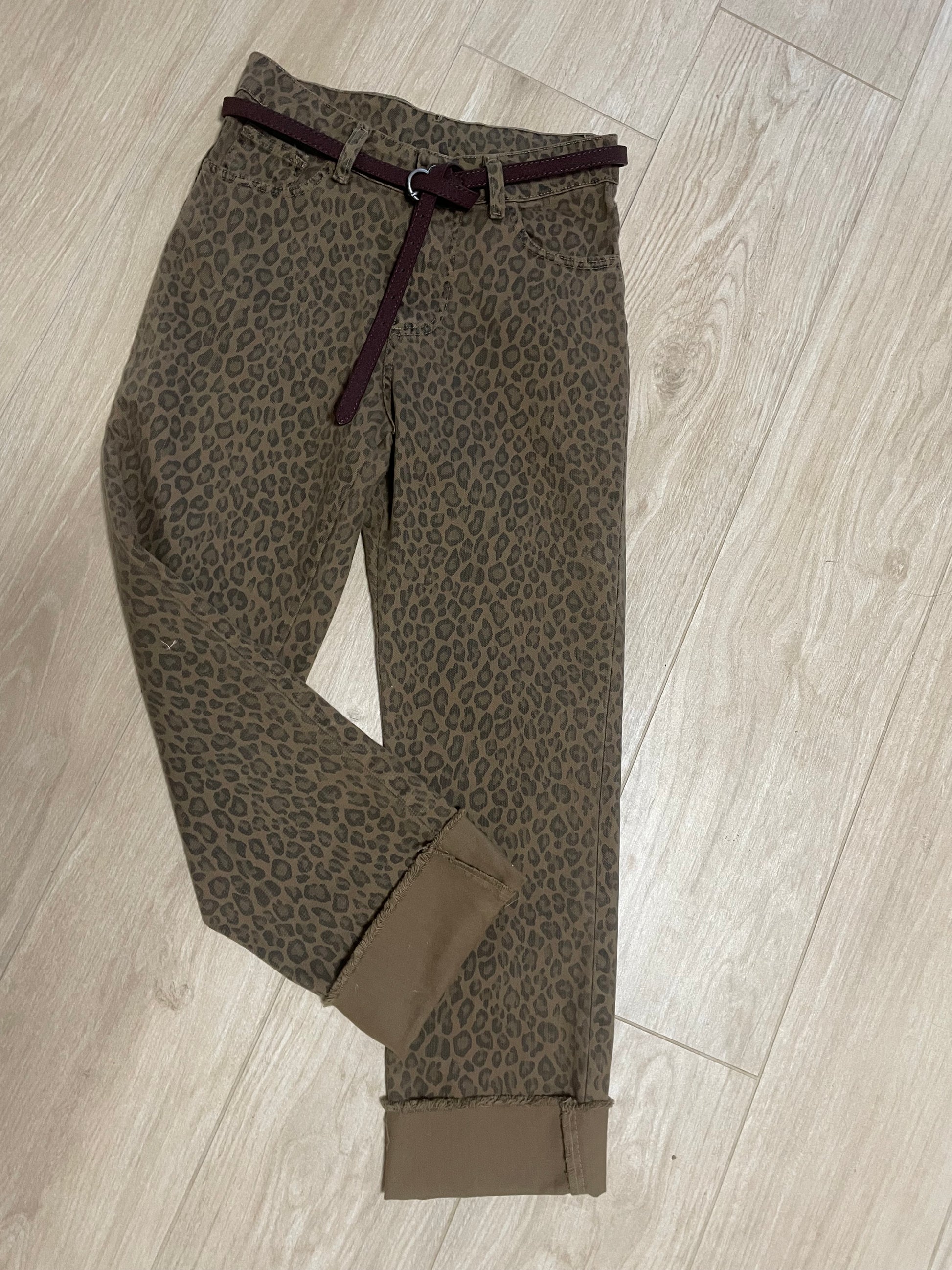 Modello a vita regolare, con tasche davanti e dietro. Particolarità del risvolto alto e sfrangiato a fine gamba. Rimane luenghezza caviglia.
