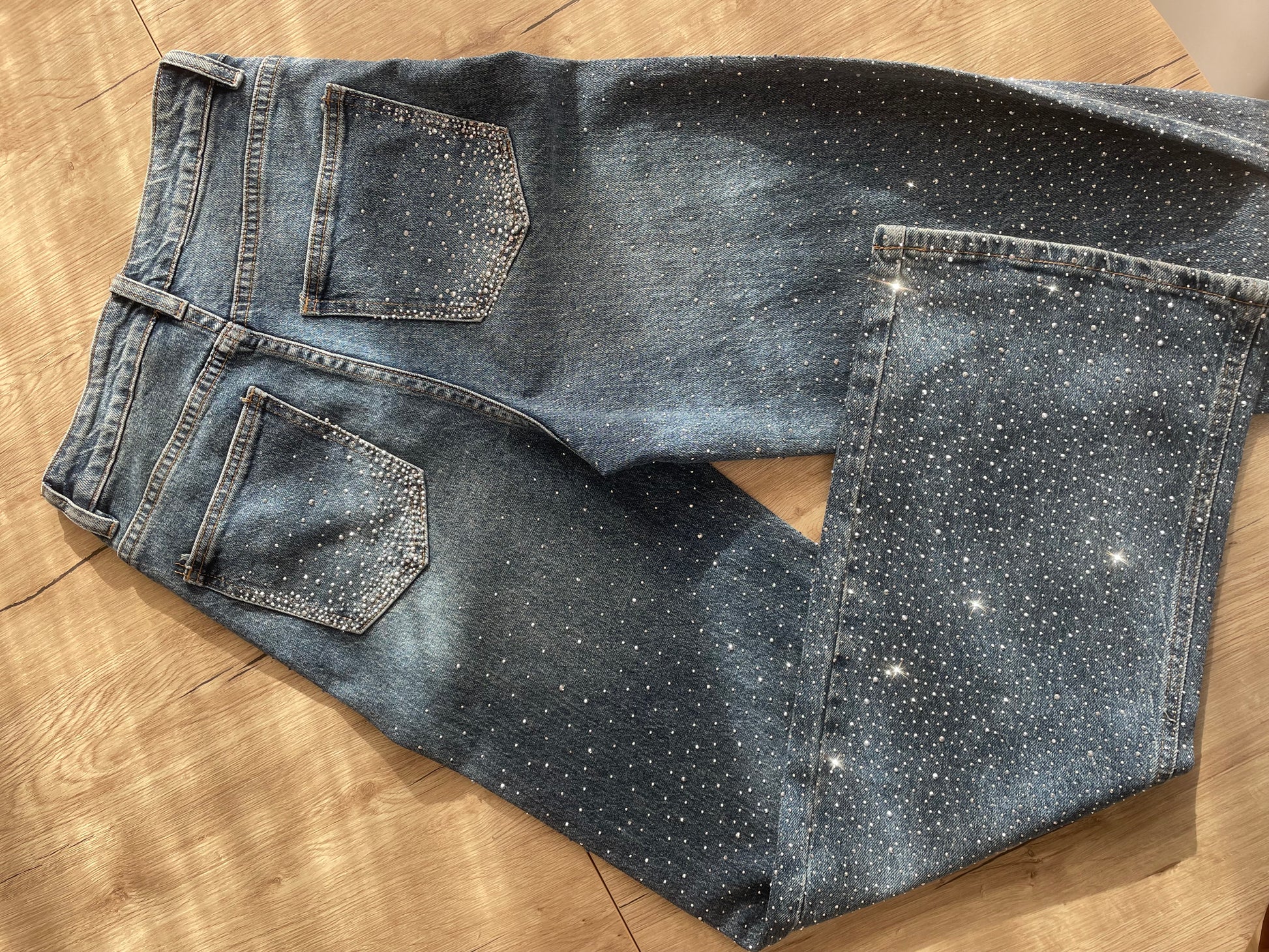 Ricoperto di brillantini su tutta la gamba… intorno alla tasca posizionati per formare un motivo differente.