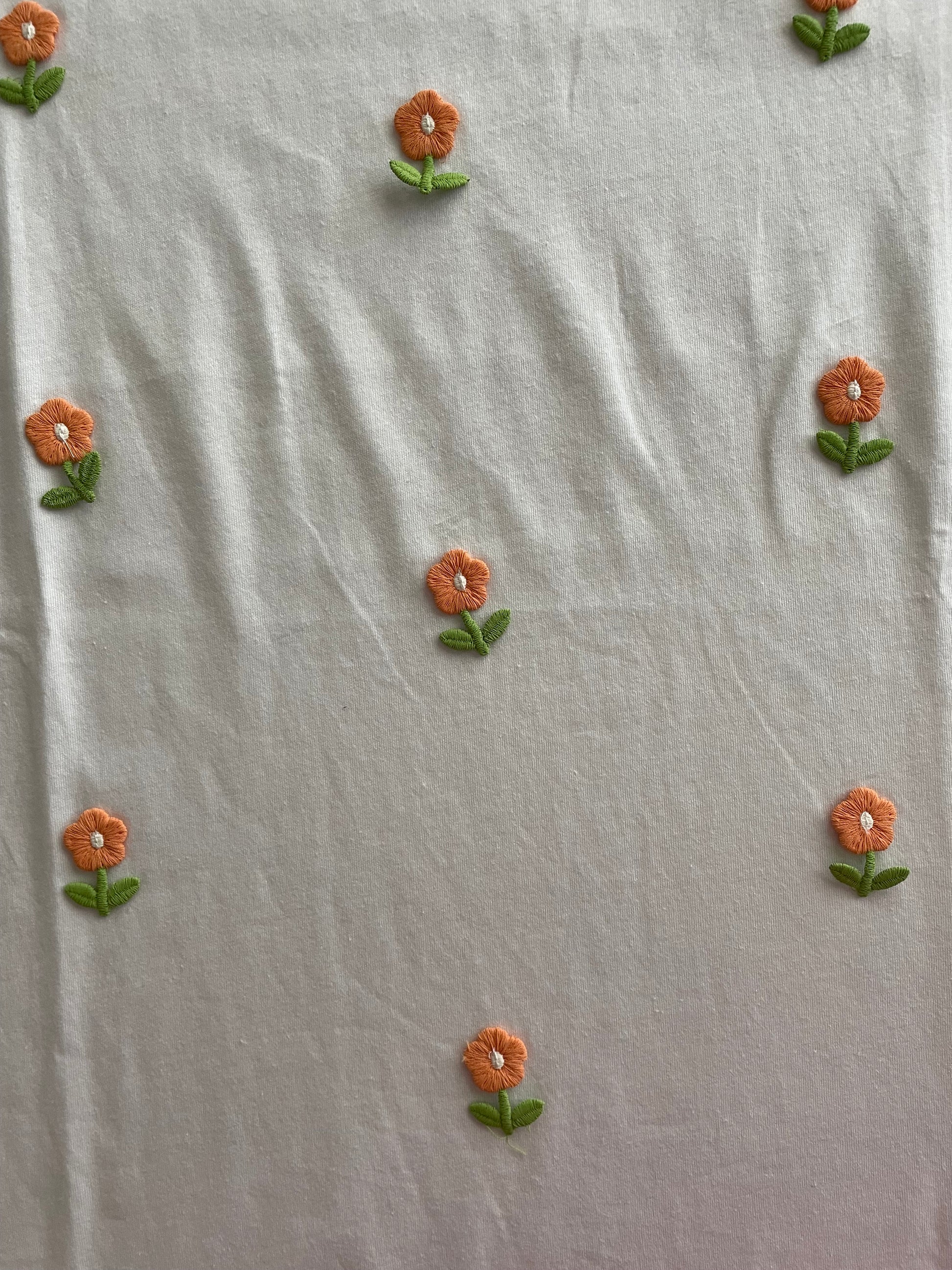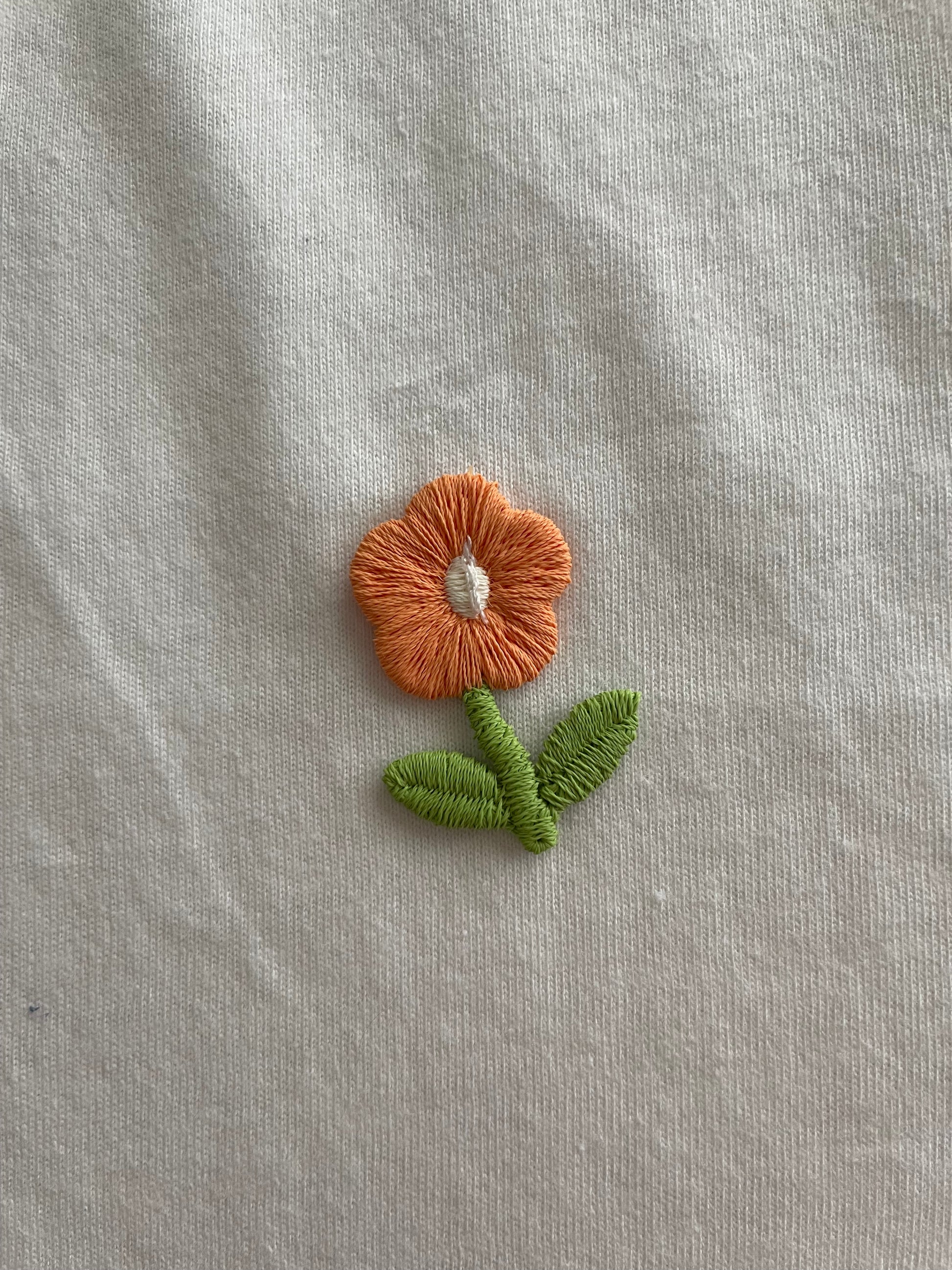 T-shirt bianca con applicati fiorellini ricamati arancio.