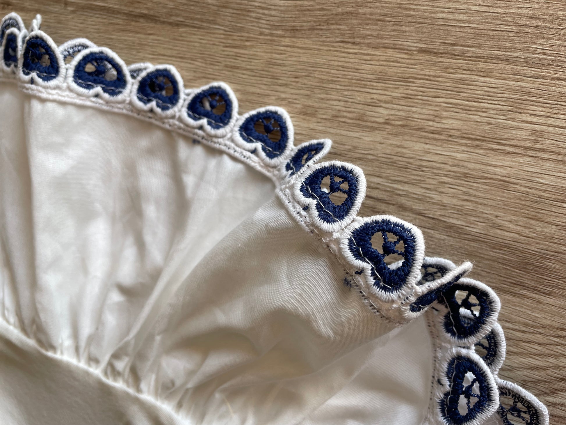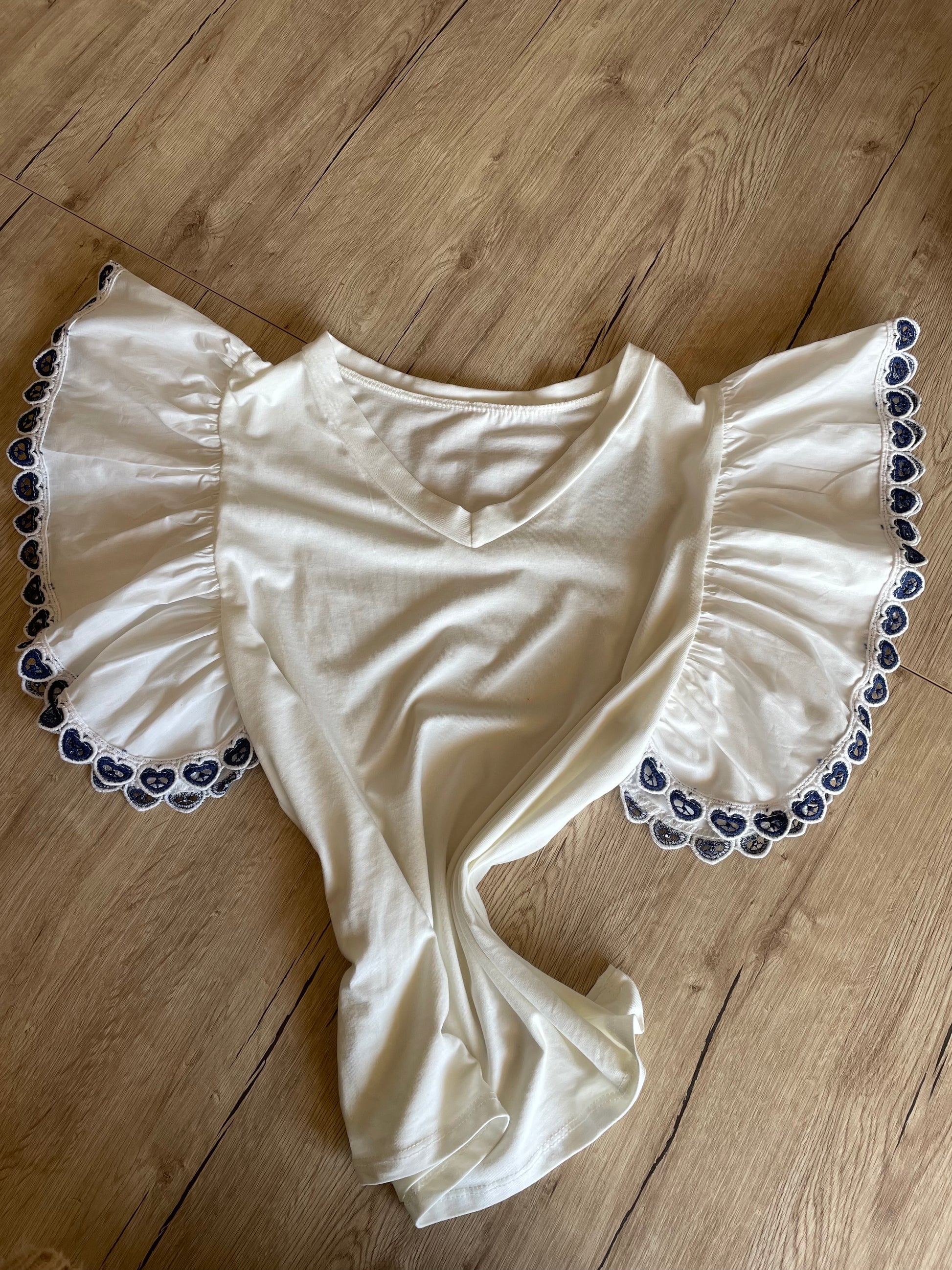 T-shirt bianca in cotone elasticizzato, scollo leggermente a V, impreziosita da una mezza manica ampia ,bianca, con bordo rifinito da cuoricini blu.