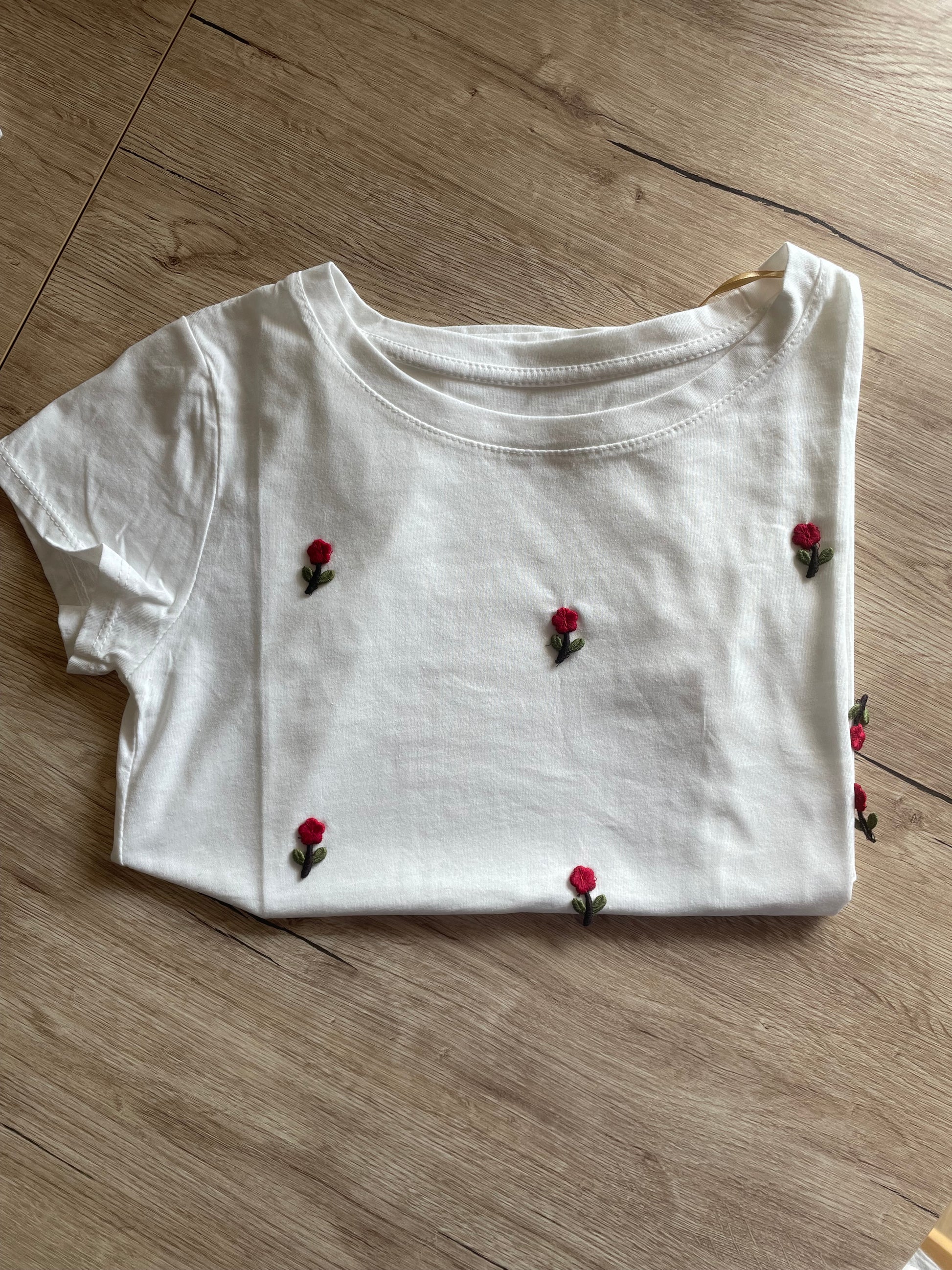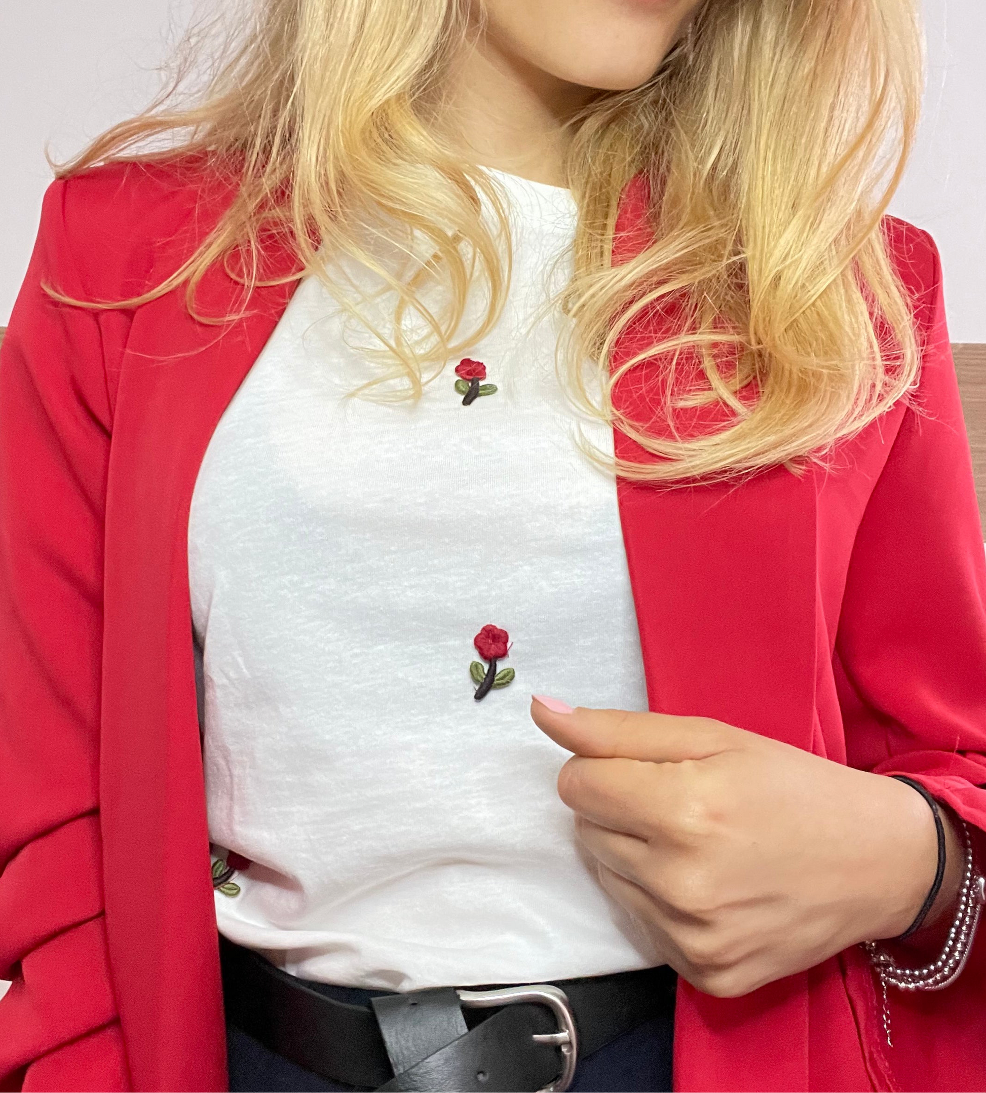 T-shirt bianca in puro cotone, mezza manica, girocollo, con applicato fiori rossi ricamati.