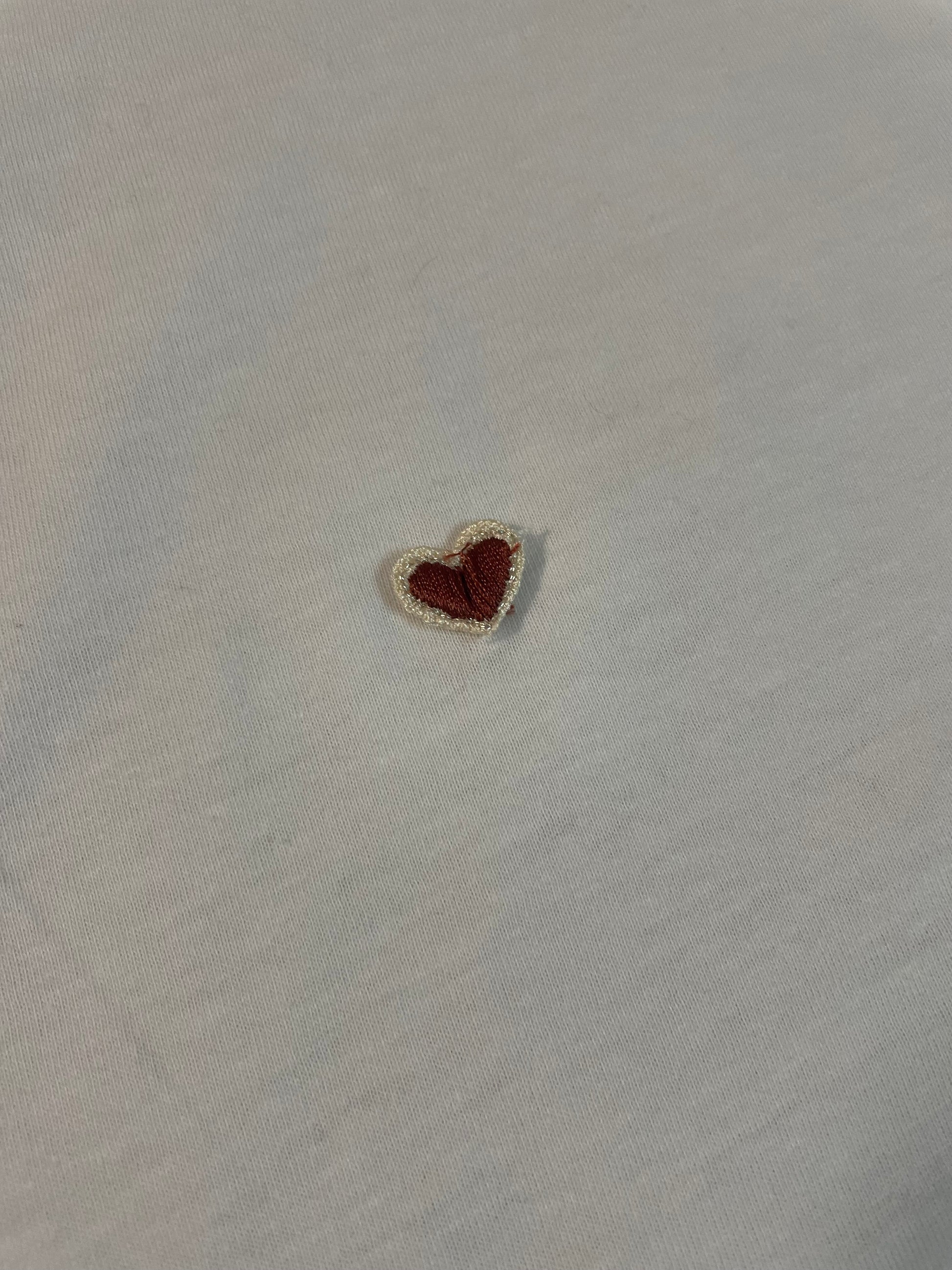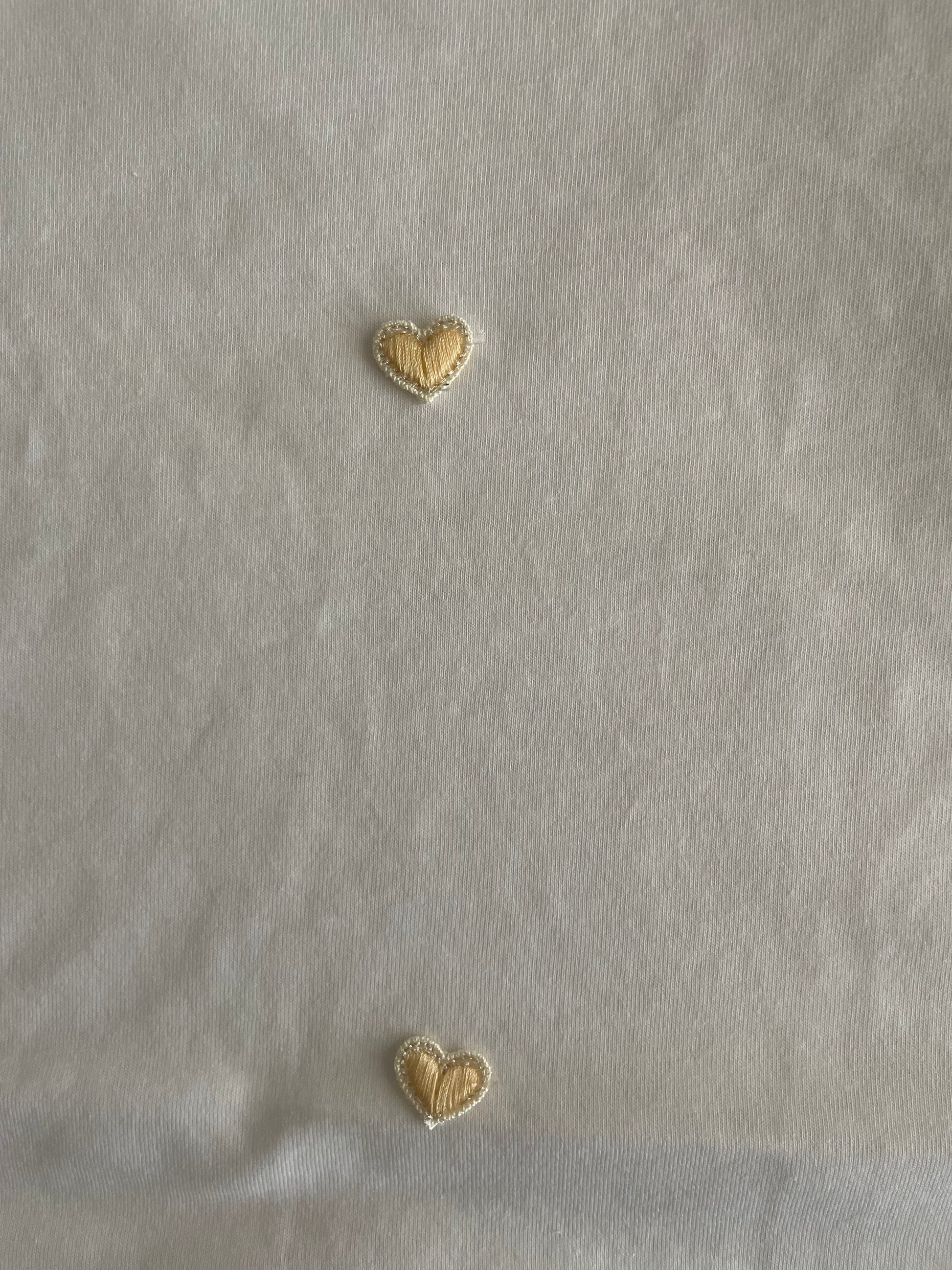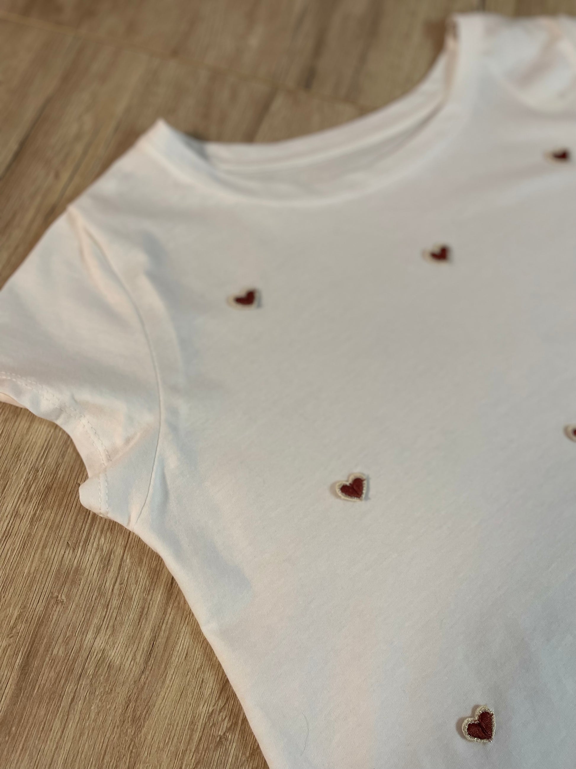 T-shirt bianca, girocollo, con applicati cuoricini rossi o gialli, ricamati.