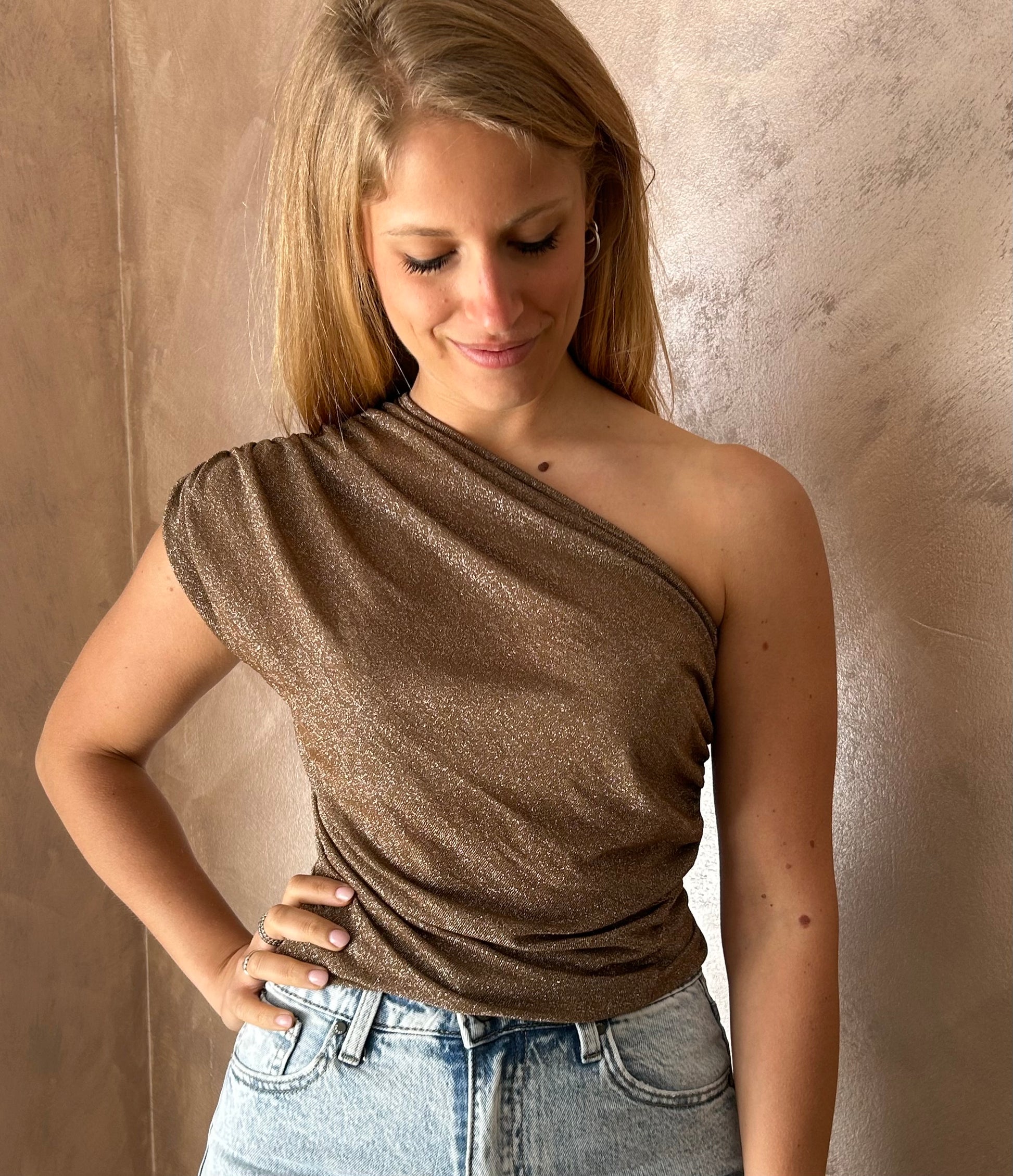 Top monospalla lurex (Susy Mix) con arriccio laterale, dalla linea essenziale ma raffinata.