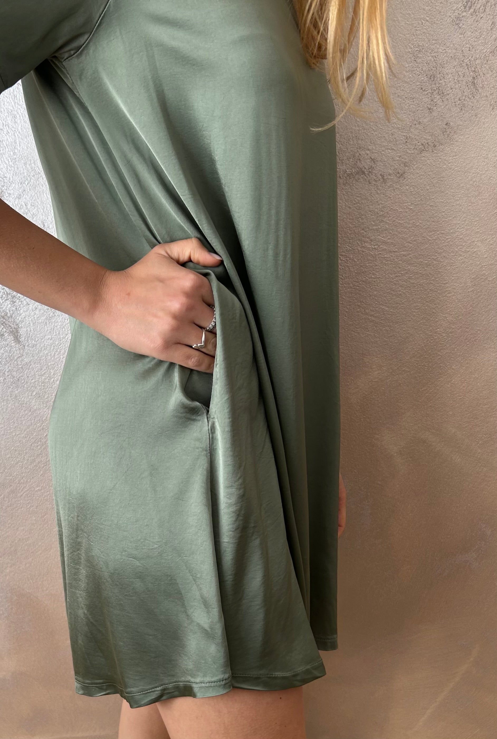 Un abitino in satin basic ma senza tempo. Da portare in a primavera ma anche in autunno.